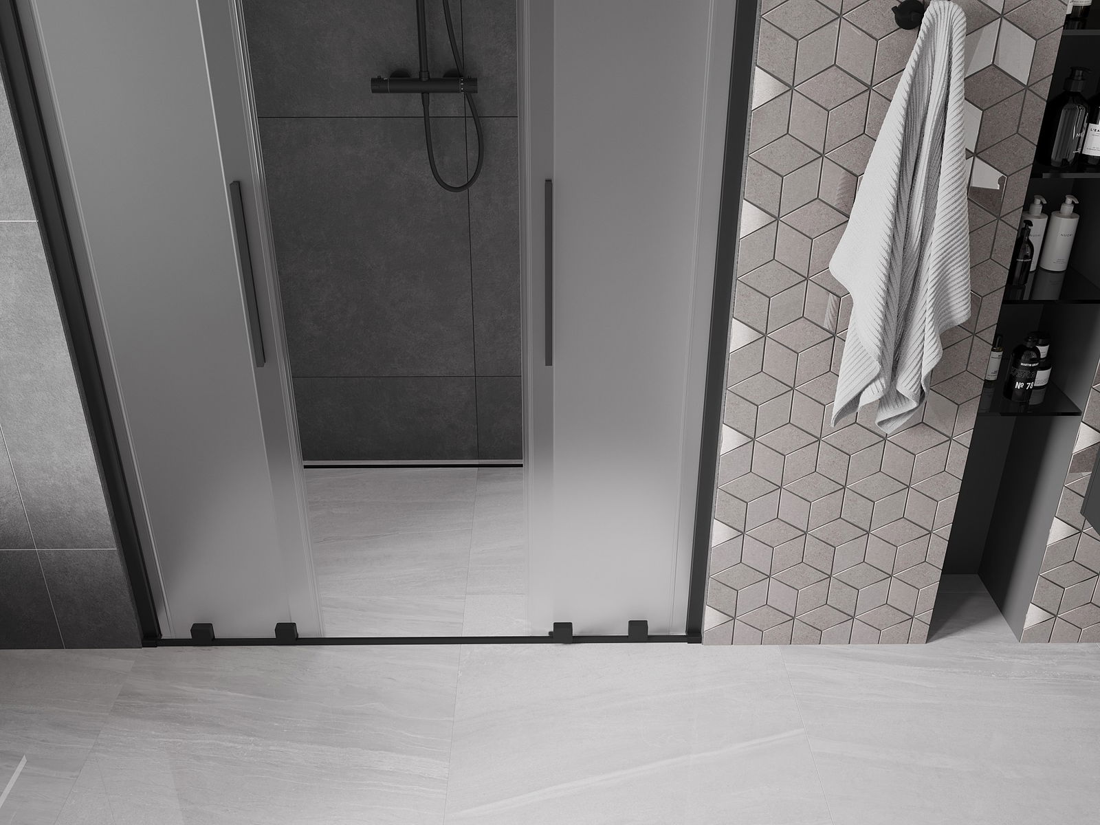 Практичната и удобна дръжка е изработена от неръждаема стомана. Модерната форма в комбинация с покритие, съчетано с цвета на профилите, придава на цялото съвременен и стилен вид, подчертавайки естетиката на всяка баня.