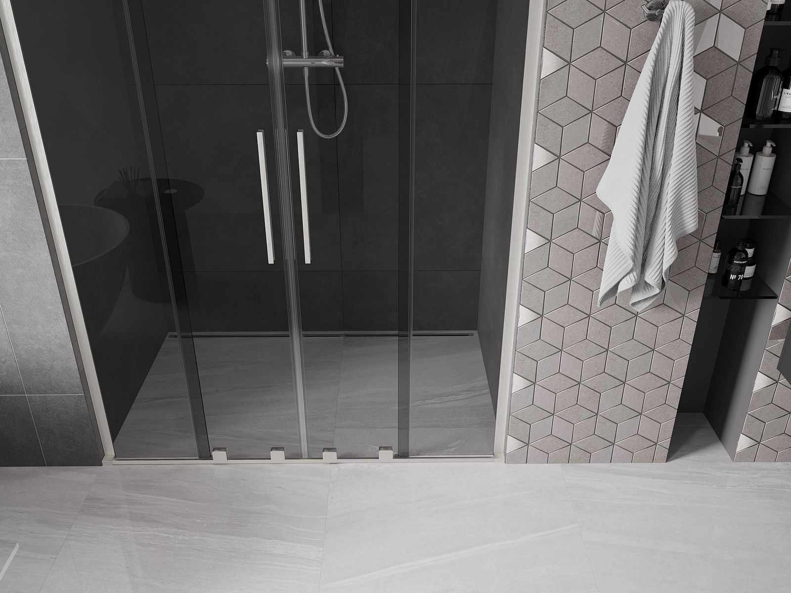 Практичната и удобна дръжка е изработена от неръждаема стомана. Модерната форма в комбинация с покритие, съчетано с цвета на профилите, придава на цялото съвременен и стилен вид, подчертавайки естетиката на всяка баня.