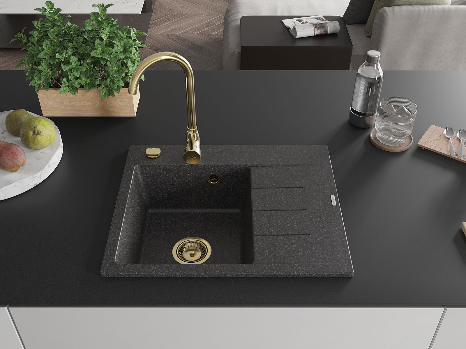 Mexen Ben гранитна мивка с 1 отделение и отцедник, лява, 600 x 500 мм, черно с