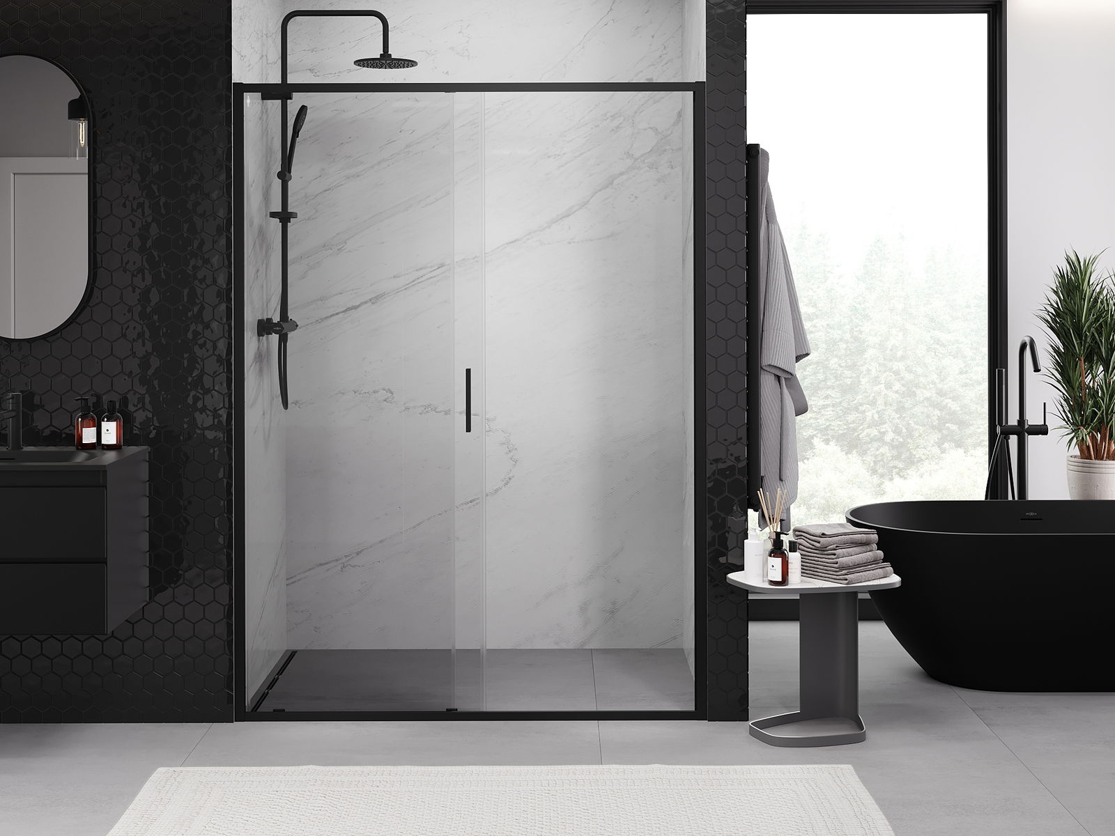 Mexen Exo плъзгащи се душ врати 140 см, прозрачни, черни - 8151-140-000-70-00