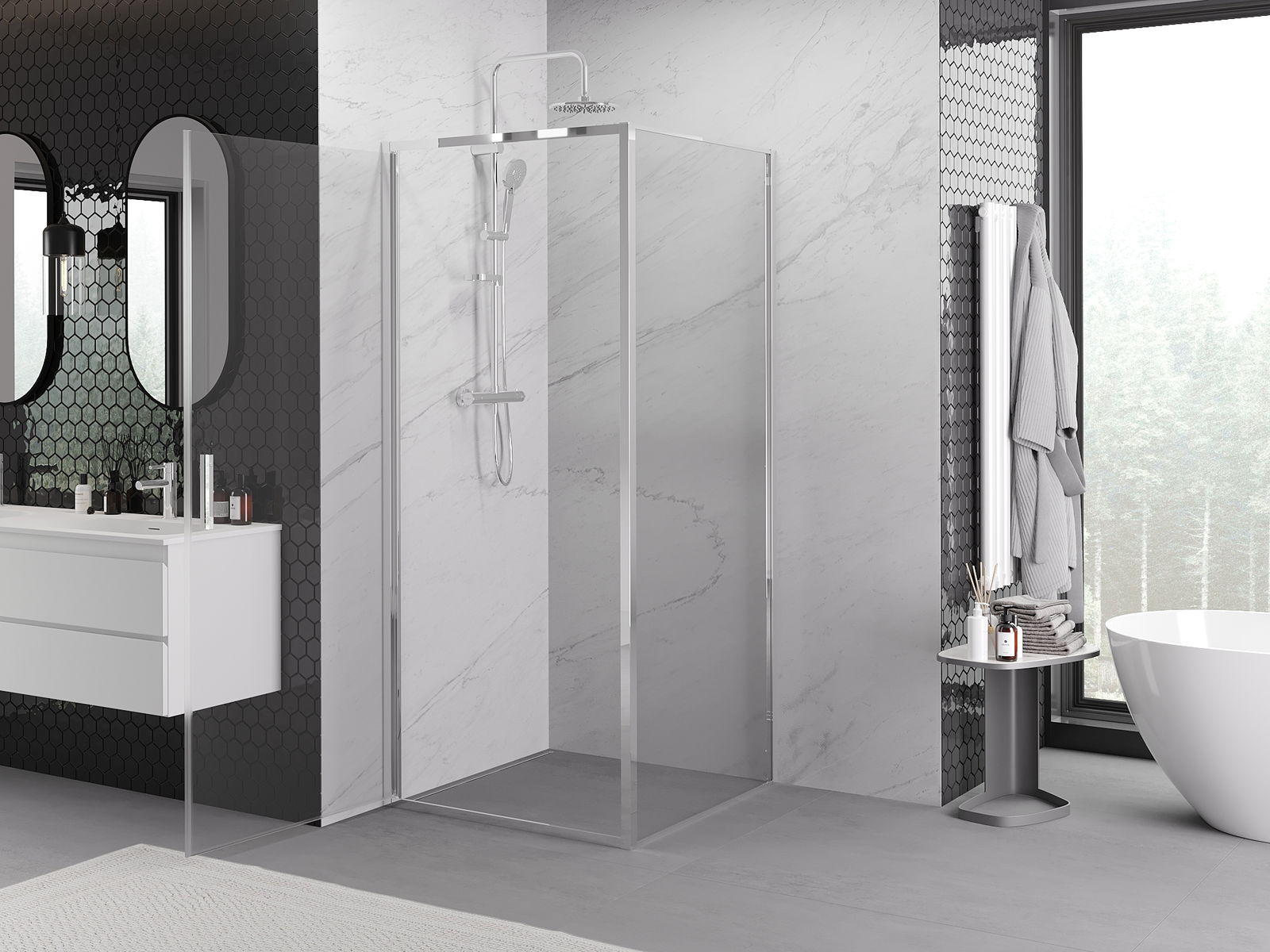 Благодарение на използването на универсалната система за монтаж, душовите врати могат да бъдат монтирани отдясно или отляво, в зависимост от нуждите. Благодарение на това можете лесно да проектирате душ, който е напаснат към пространството в банята.