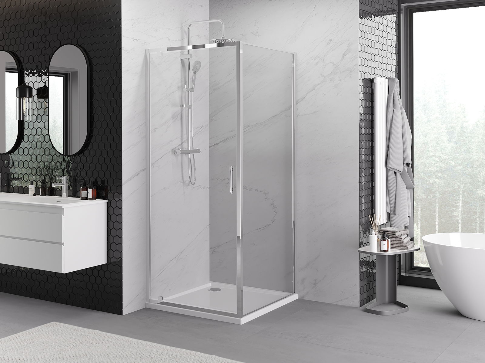 Удобната и практична дръжка е изработена от здрав и устойчив метал. Модерната форма в съчетание с покритието, съответстващо на цвета на профилите, придава на цялото модерен и стилен вид, подчертавайки естетиката на всяка баня.