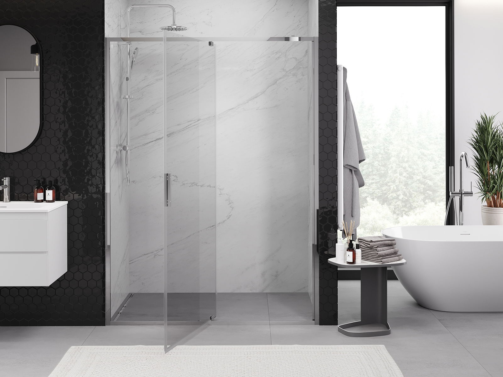 Благодарение на използването на универсалната система за монтаж, душовите врати могат да бъдат монтирани отдясно или отляво, в зависимост от нуждите. Благодарение на това можете лесно да проектирате душ, който е напаснат към пространството в банята.