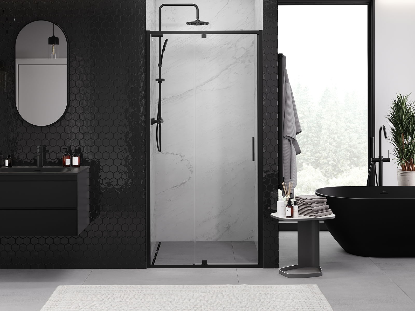 Удобната и практична дръжка е изработена от здрав и устойчив метал. Модерната форма в съчетание с покритието, съответстващо на цвета на профилите, придава на цялото модерен и стилен вид, подчертавайки естетиката на всяка баня.