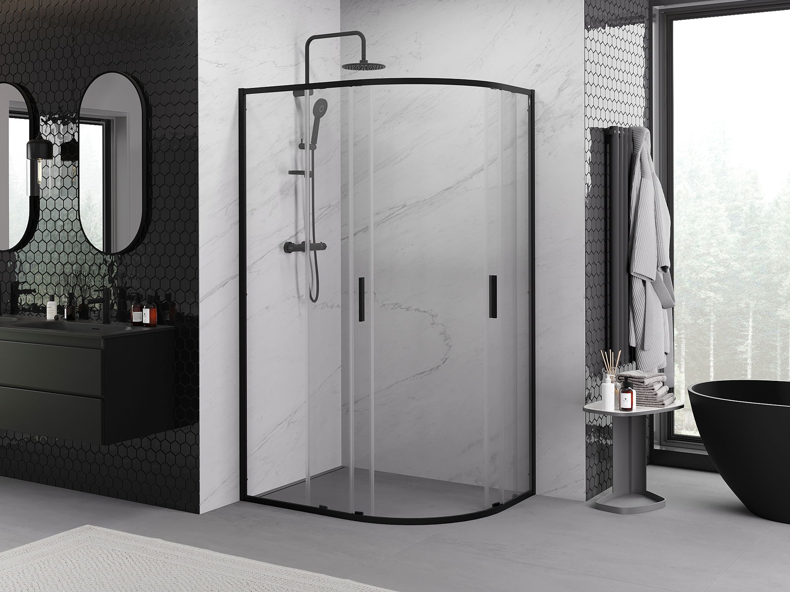 Mexen Exo асиметрична плъзгаща се душ кабина полукръгла 120 x 90 cm, прозрачна, черна - 8132-120-090-70-00