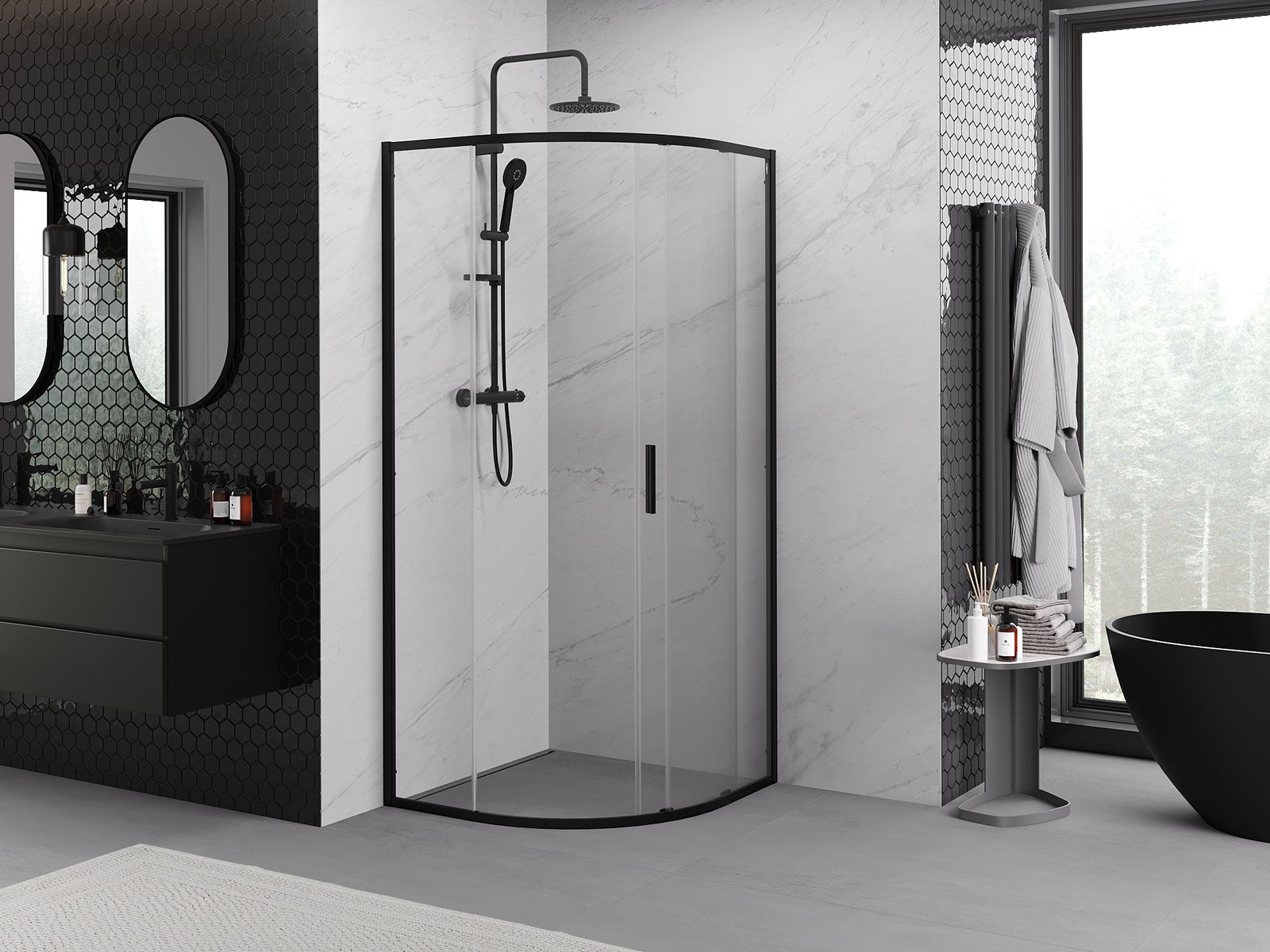 Mexen Exo заоблена душ кабина с плъзгащи врати 90 x 90 см, прозрачна, черна - 8131-090-090-70-00