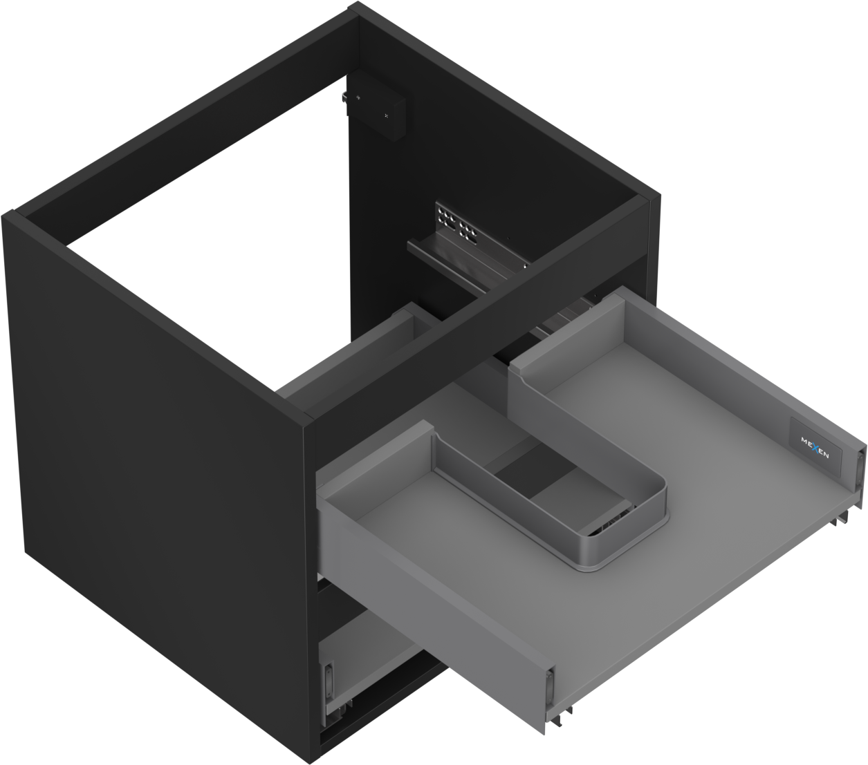 Изрезът в чекмеджето е проектиран по такъв начин, че да побере сифона, който е необходим в мивковите инсталации. Благодарение на това мебелът може да бъде монтиран напълно функционално, без да се налага отказване от пространството в чекмеджето заради инсталацията.