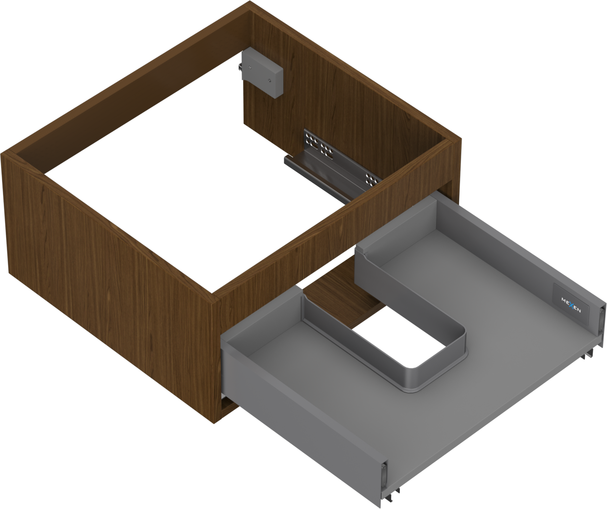 Изрезът в чекмеджето е проектиран по такъв начин, че да побере сифона, който е необходим в мивковите инсталации. Благодарение на това мебелът може да бъде монтиран напълно функционално, без да се налага отказване от пространството в чекмеджето заради инсталацията.