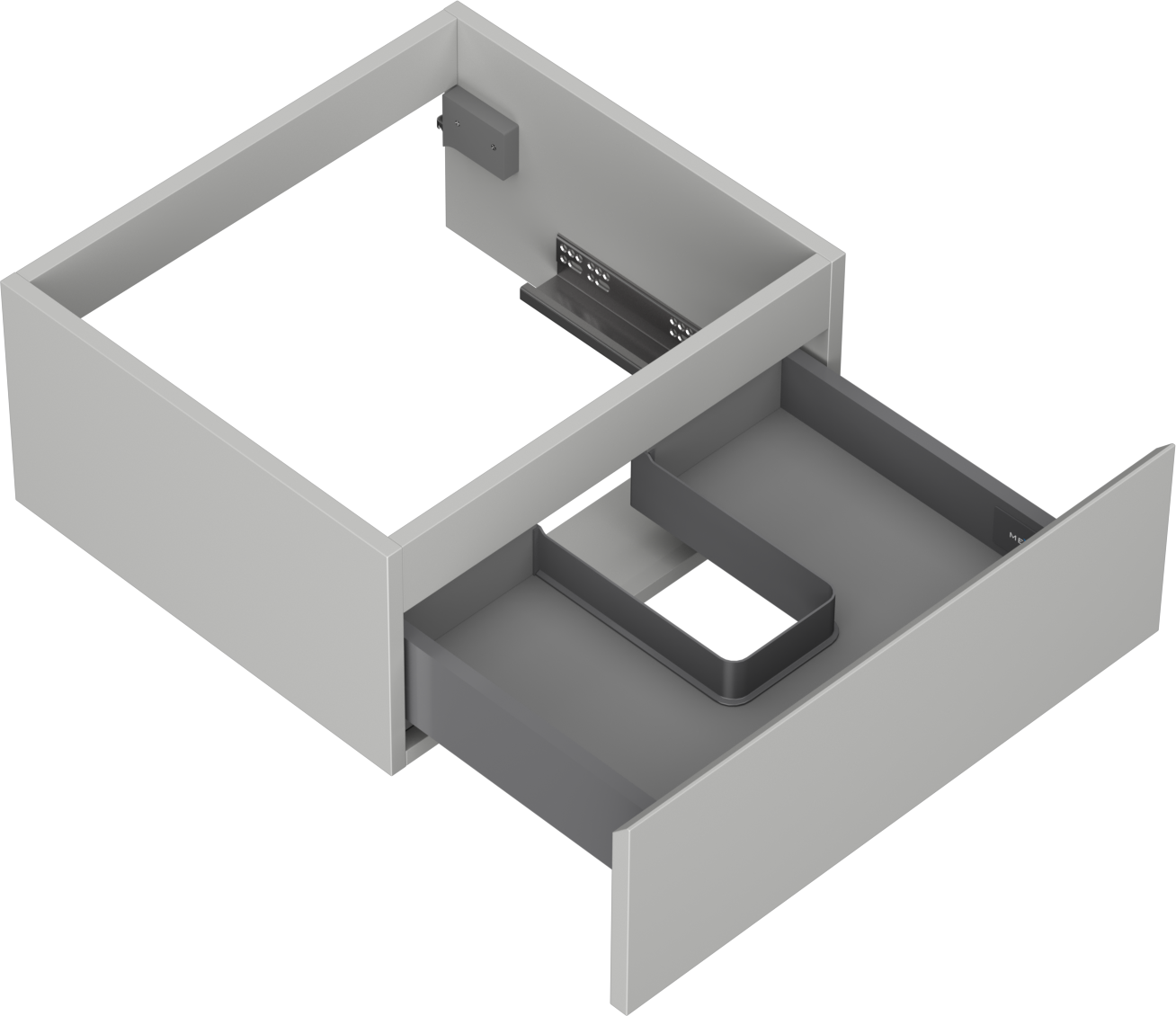 Изрезът в чекмеджето е проектиран по такъв начин, че да побере сифона, който е необходим в мивковите инсталации. Благодарение на това мебелът може да бъде монтиран напълно функционално, без да се налага отказване от пространството в чекмеджето заради инсталацията.