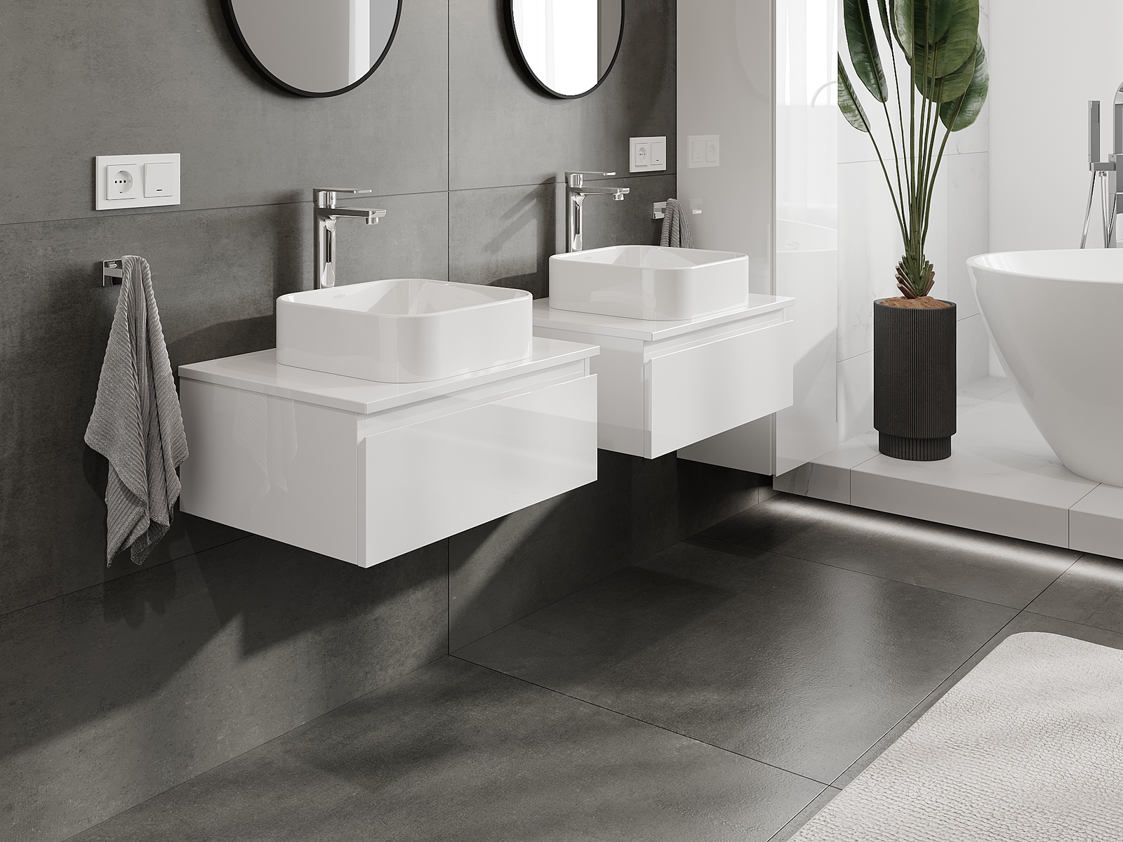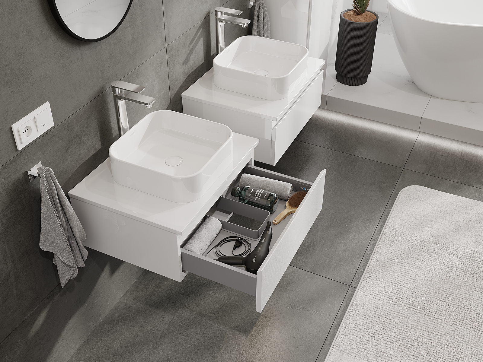 Нашите модулни мебели за баня могат да се комбинират в различни цветови конфигурации, което позволява пълна персонализация. Може да се избере както външният вид, така и функциите на отделните елементи, което позволява съчетаване на мебелите със собствените стилови и функционални предпочитания.