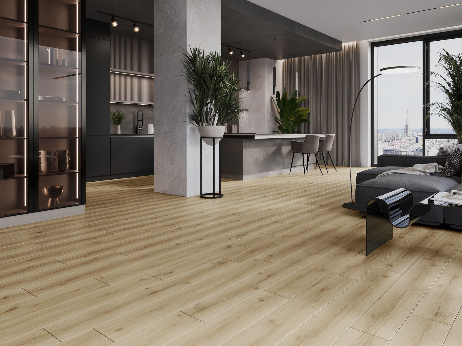 Панелите имат 4-странна фуга - всяка страна е обработена така, че при нареждане да се образува V-образно съединение. Този дизайн придава на пода по-изразена структура, което му добавя дълбочина и естетически характер. Този ефект е особено ценен в съвременните интериори, където детайлите подчертават уникалния изглед на вътрешността.