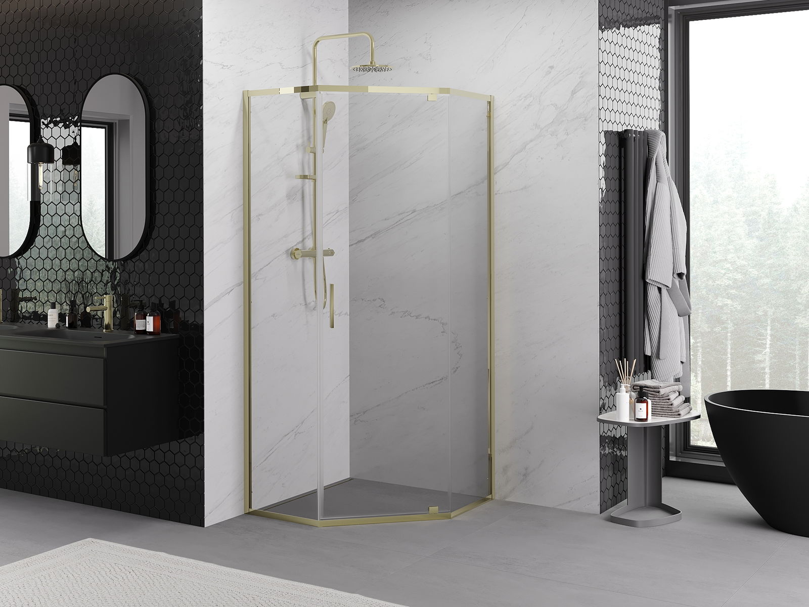 Mexen Exo петстенна душ кабина с отваряща се врата 100 x 100 cm, прозрачна, златна - 812-100-100-50-00
