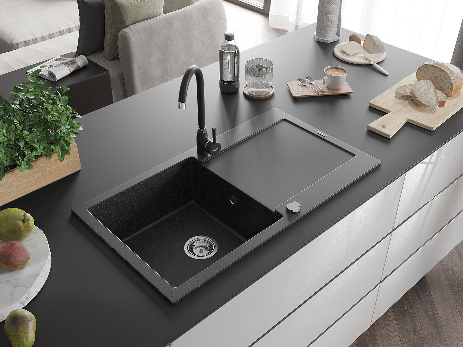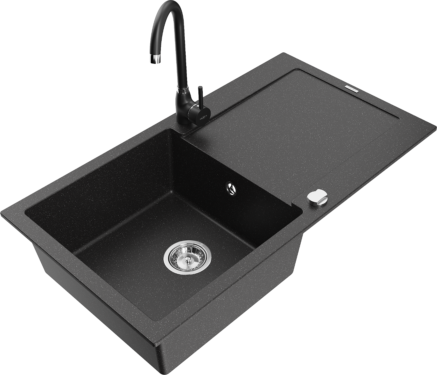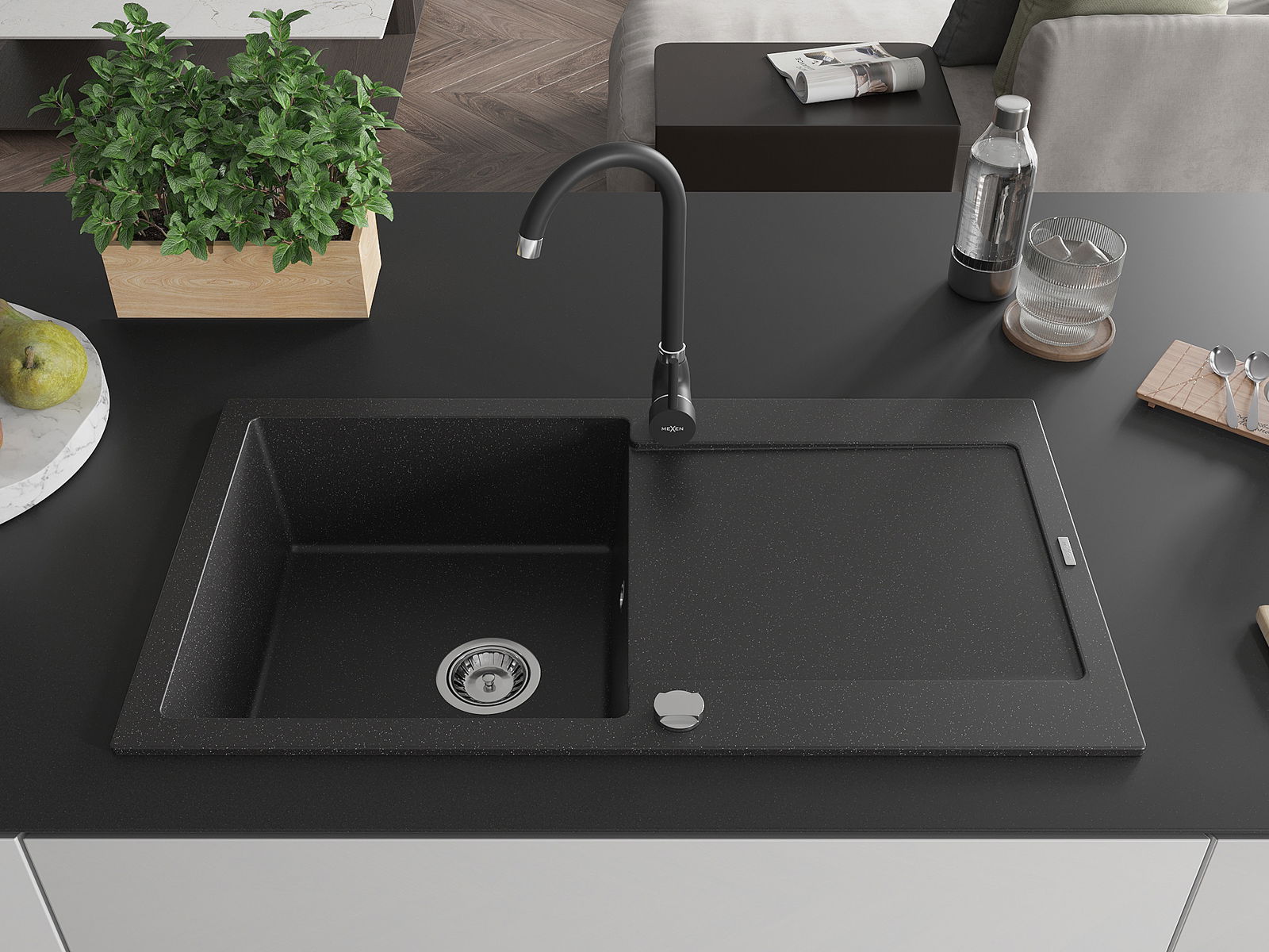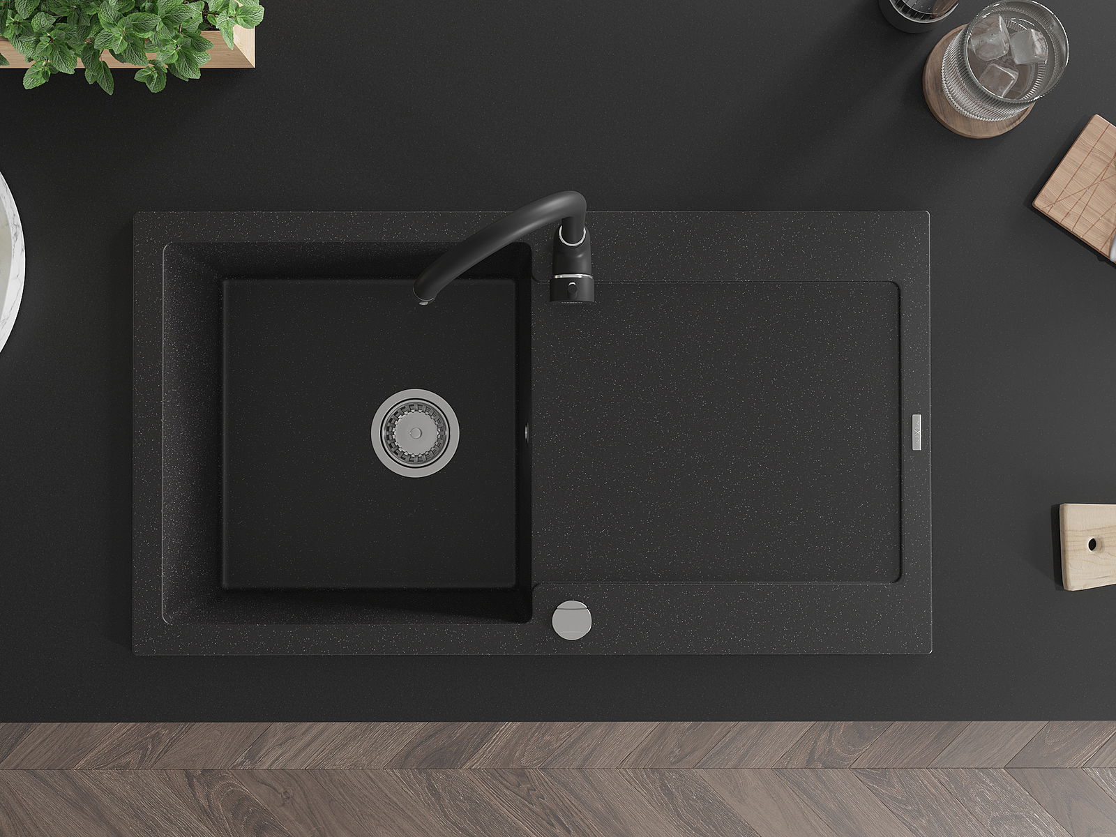 Mexen Leo кухненска мивка на гранитна основа, 1-камерна с отцедник и Telma смесител, черен/сребърен металик - 6501-73-670200-70
