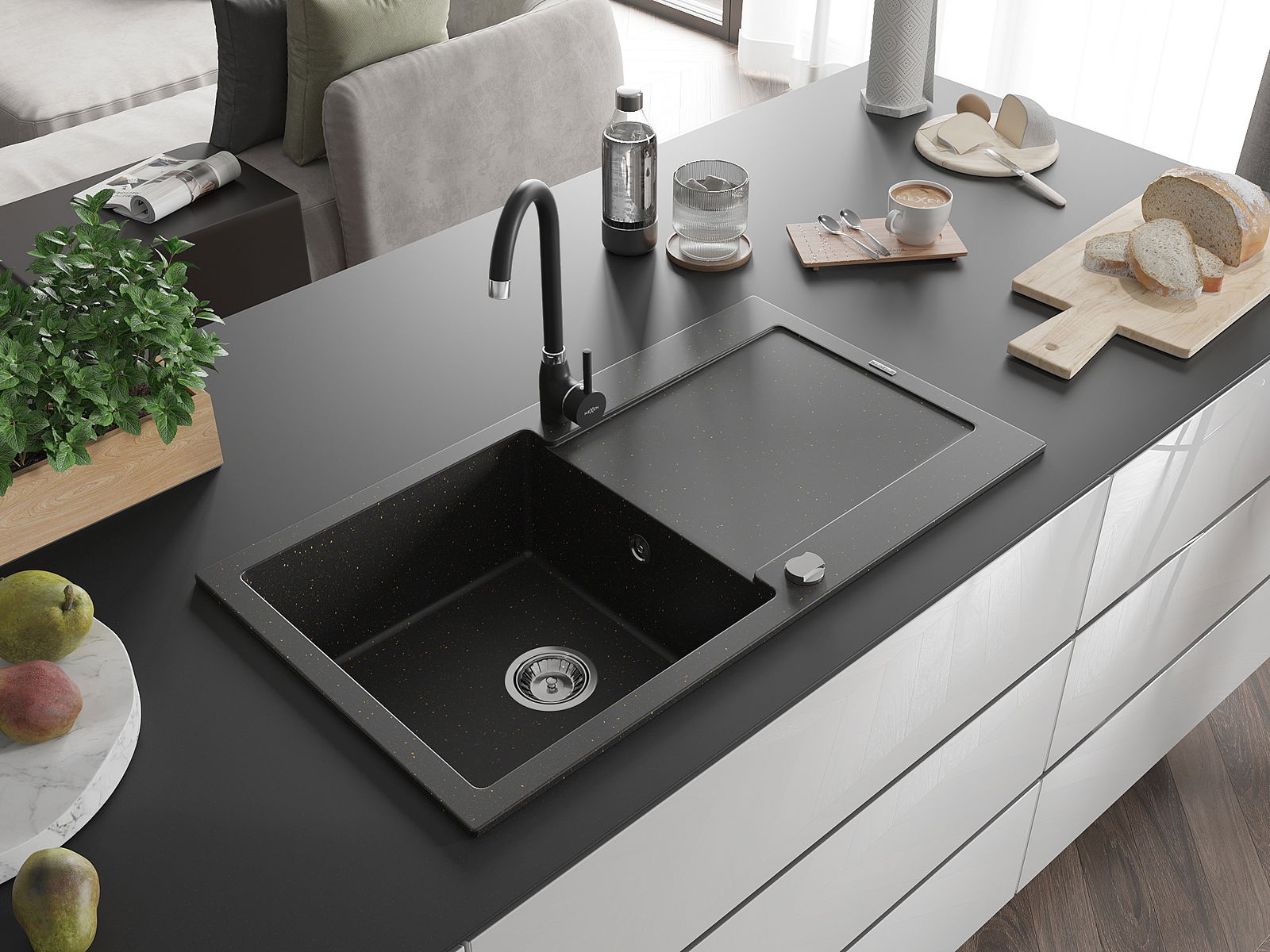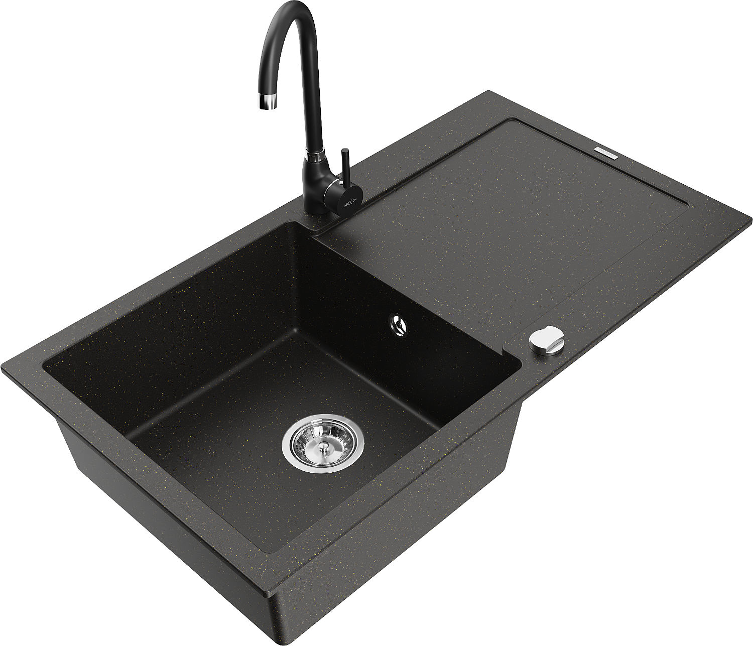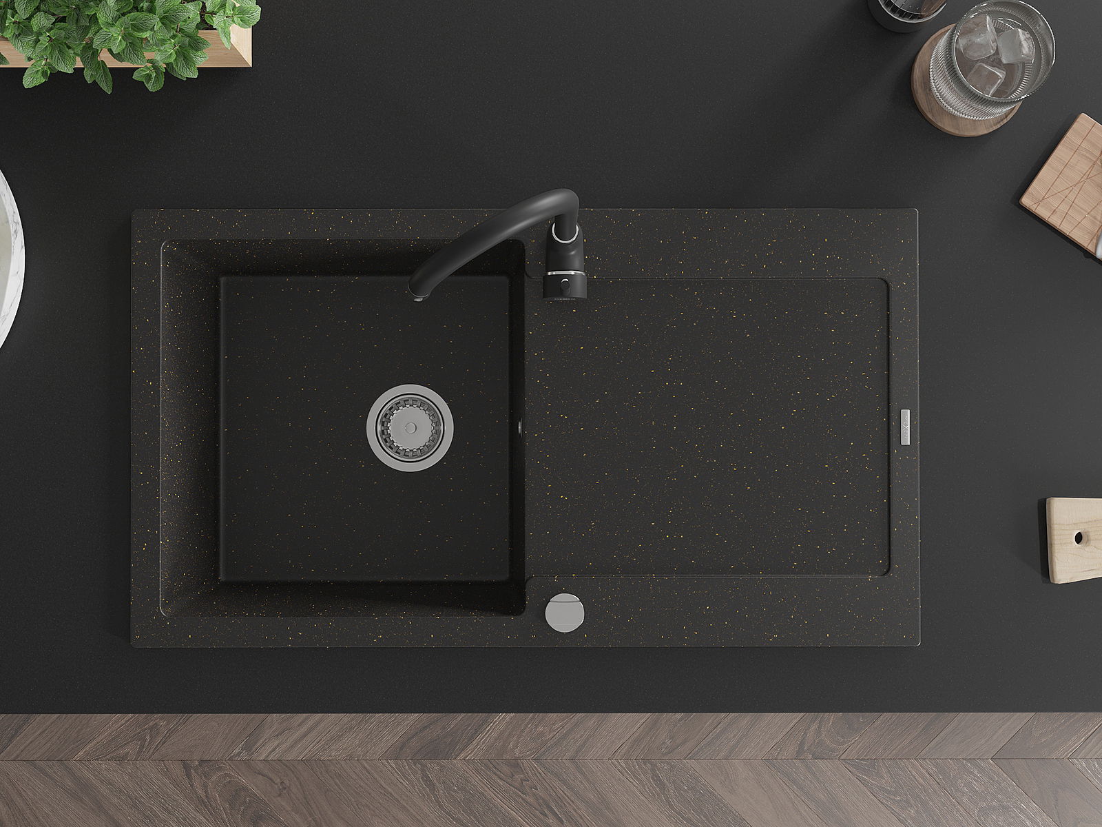 Mexen Leo мивка от гранит с 1 камера и отцедник и кухненски смесител Telma, черен/златен металиk - 6501-75-670200-70