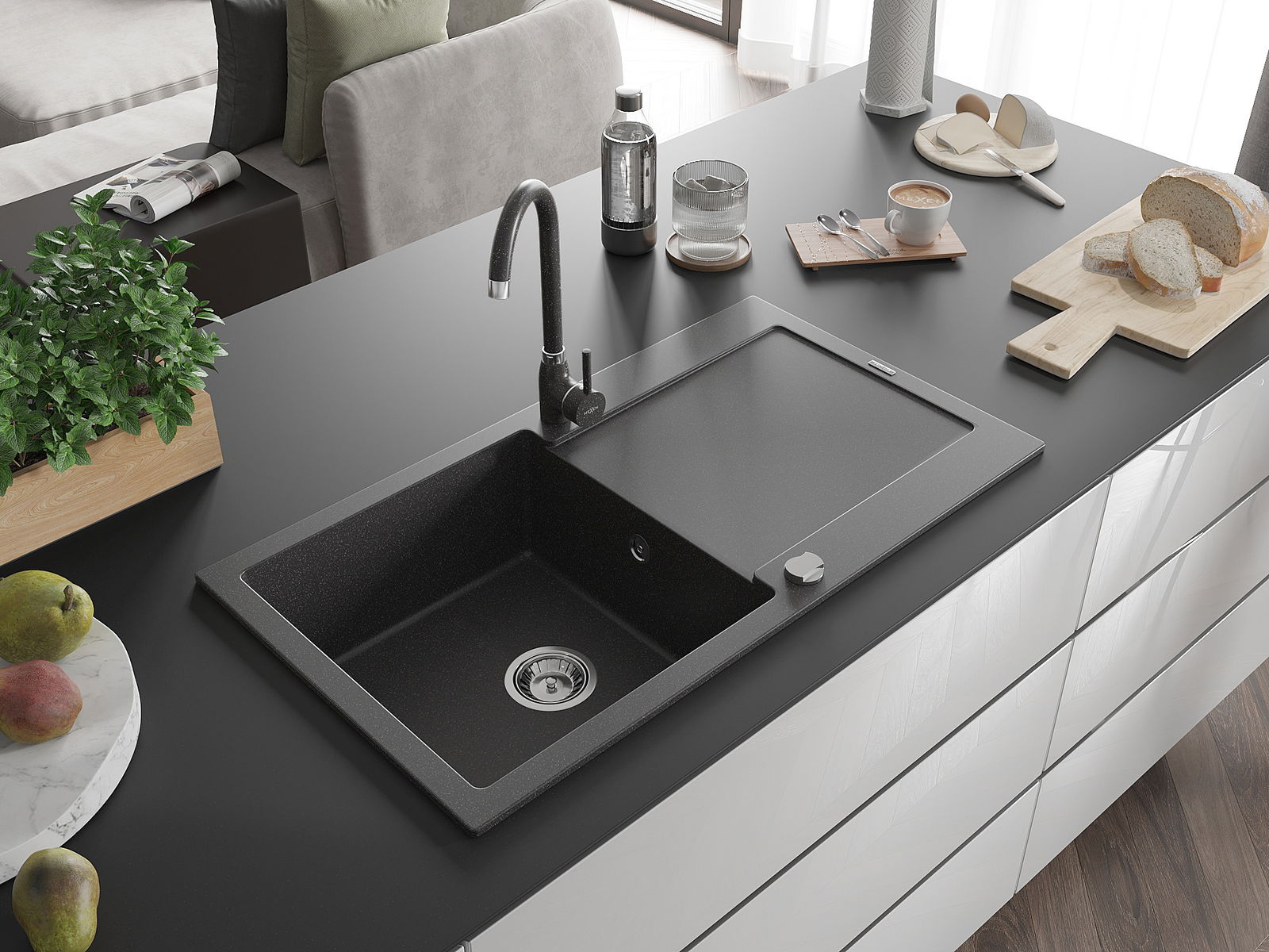 Мивката е направена от висококачествен гранит. Това е елегантно и най -вече практично допълнение към всяка кухня, независимо от нейния стил. Висококачествената и гранитна издръжливост осигуряват много години употреба.