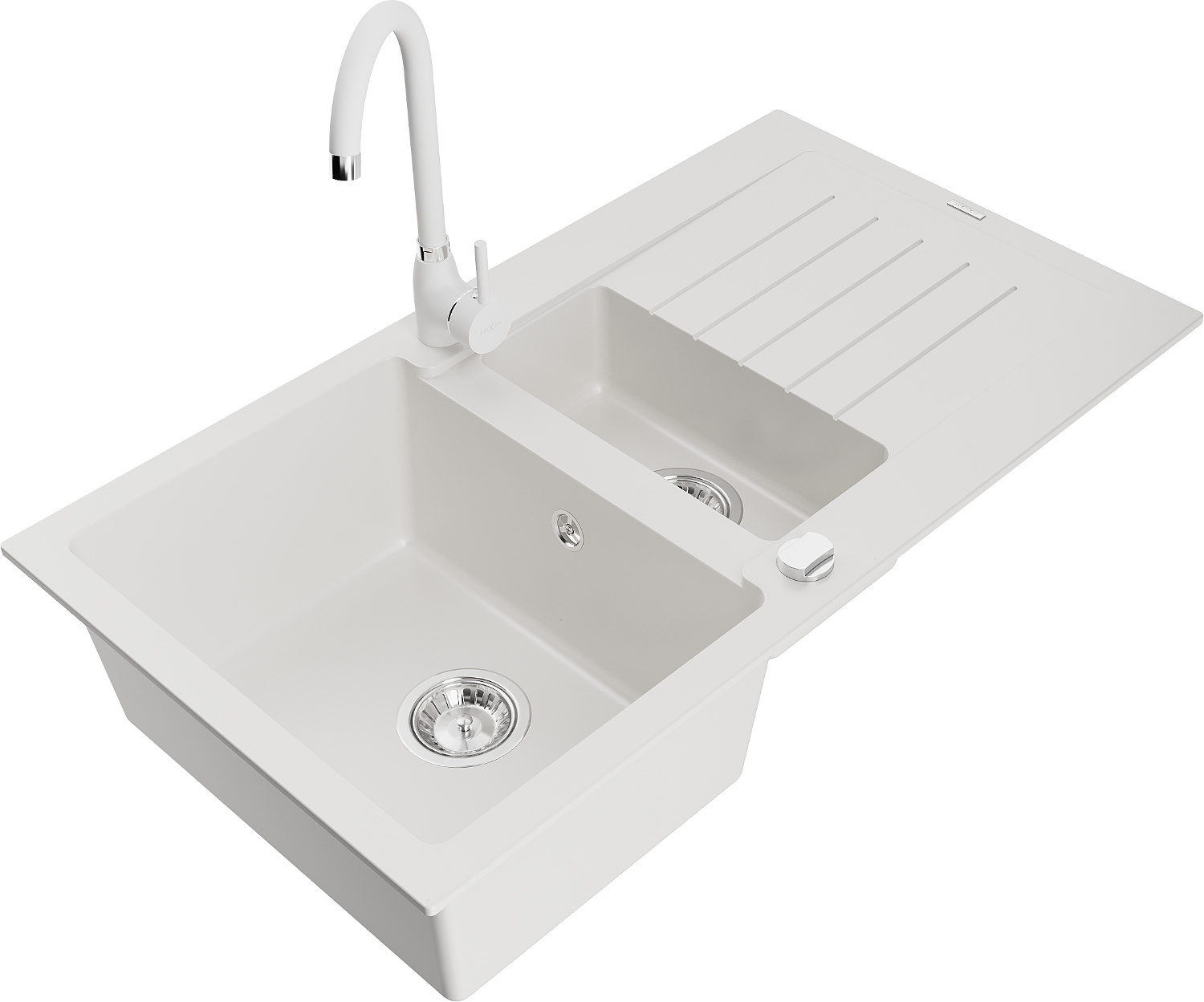 Mexen Matias гранитна мивка 1,5-камерна с отцедник и кухненски смесител Telma, бял - 6502-20-670200-20