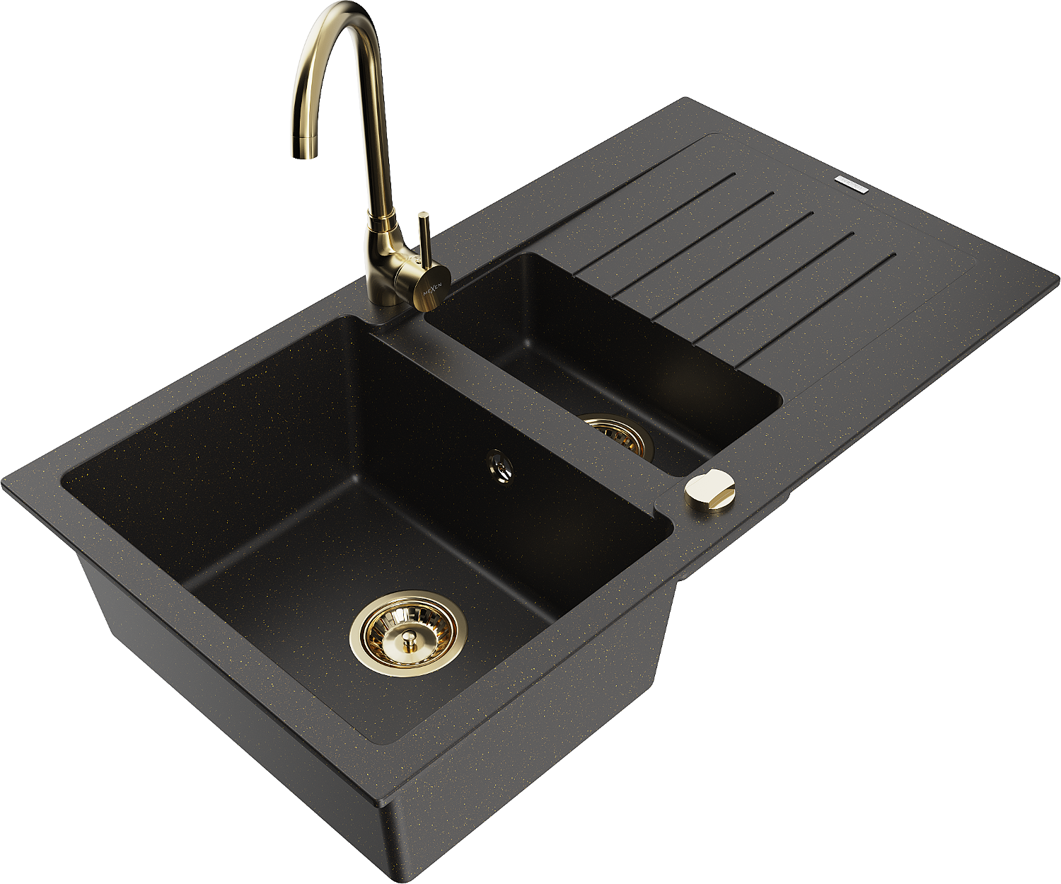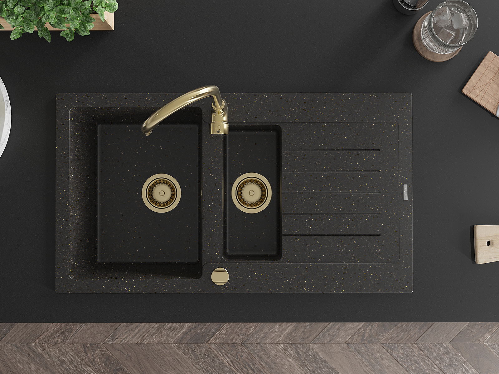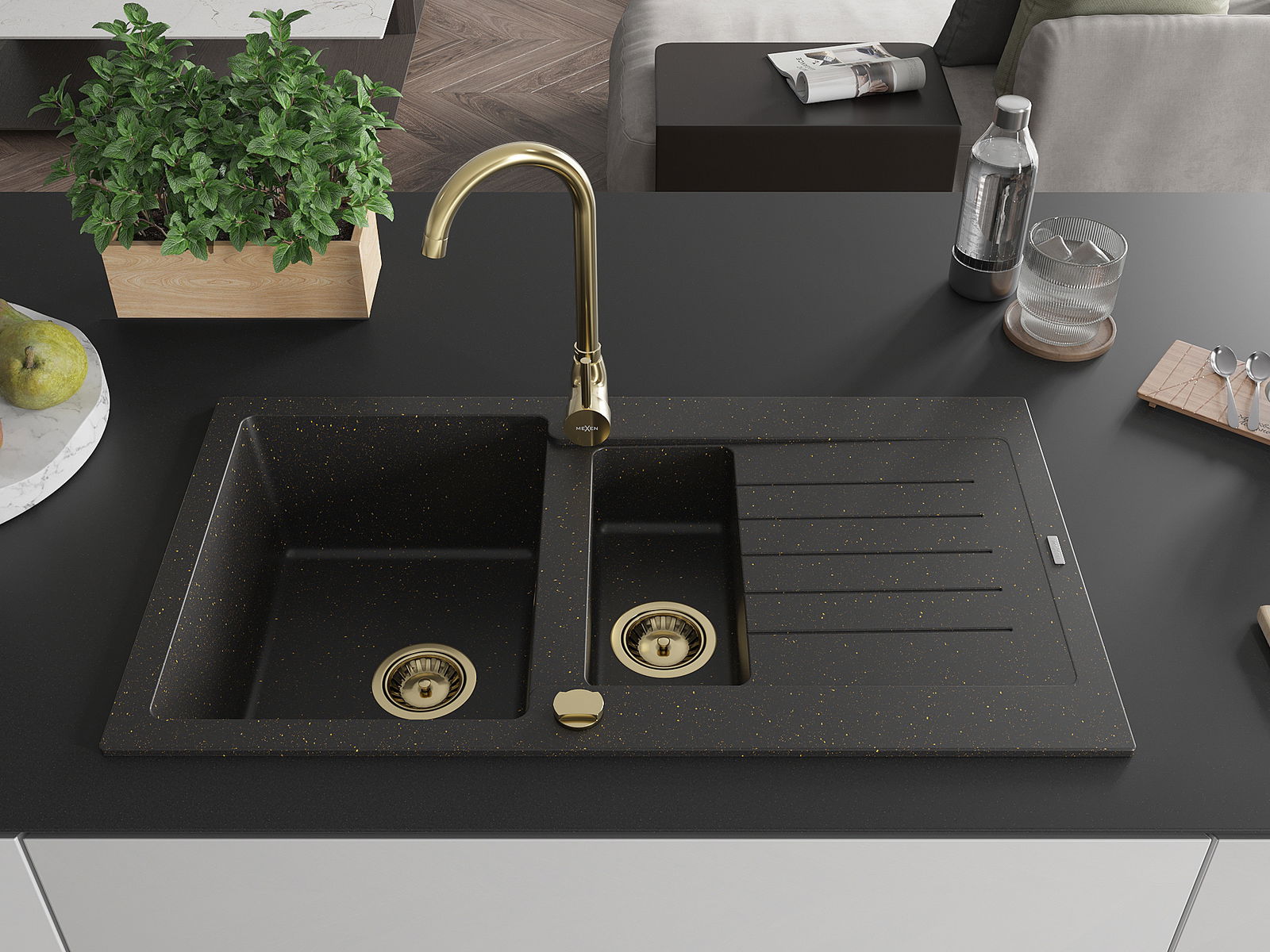 Mexen Matias гранитна мивка 1,5-камерна с отцедник и кухненски смесител Telma, черно/златно - 6502-75-670200-50