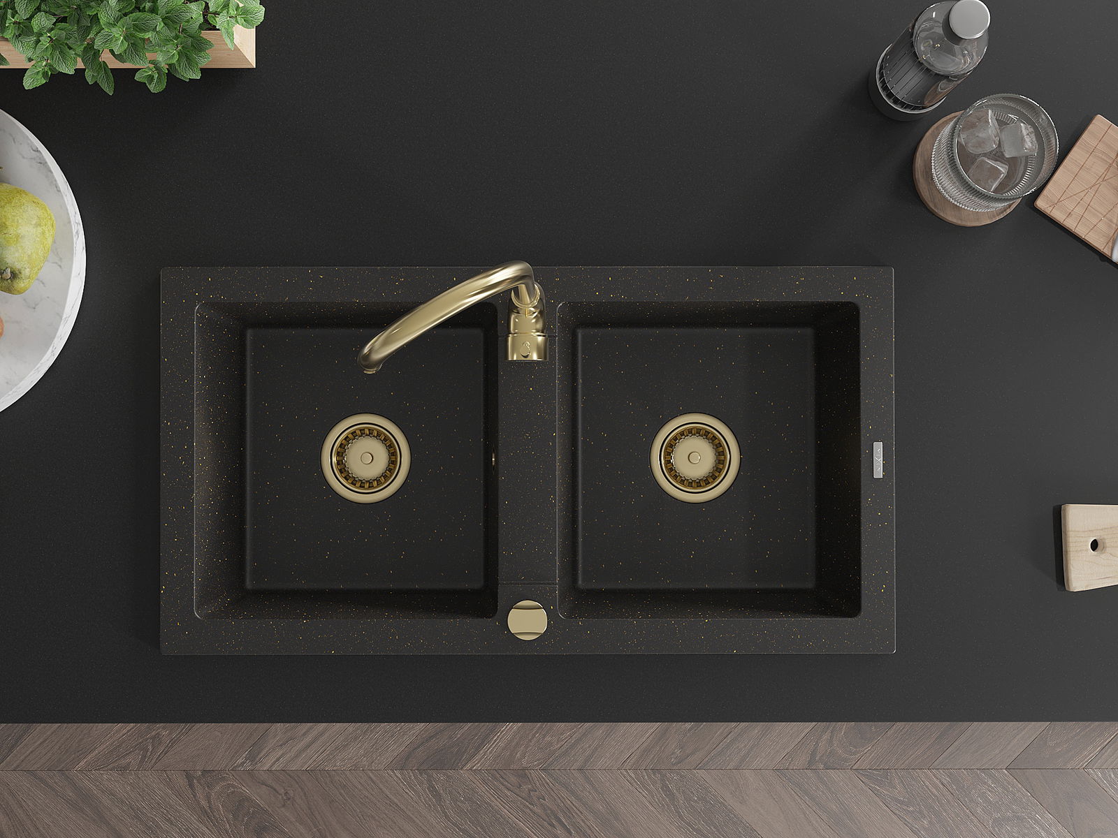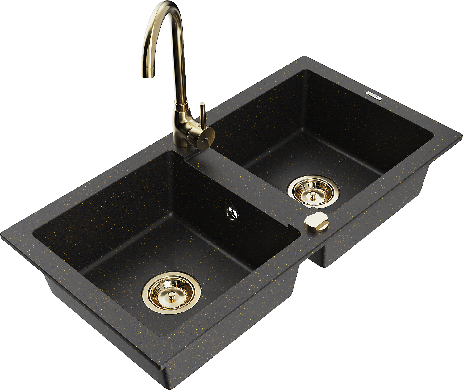 Mexen Mario двукоморна гранитна мивка с кухненски смесител Telma, черен/златен - 6504-75-670200-50