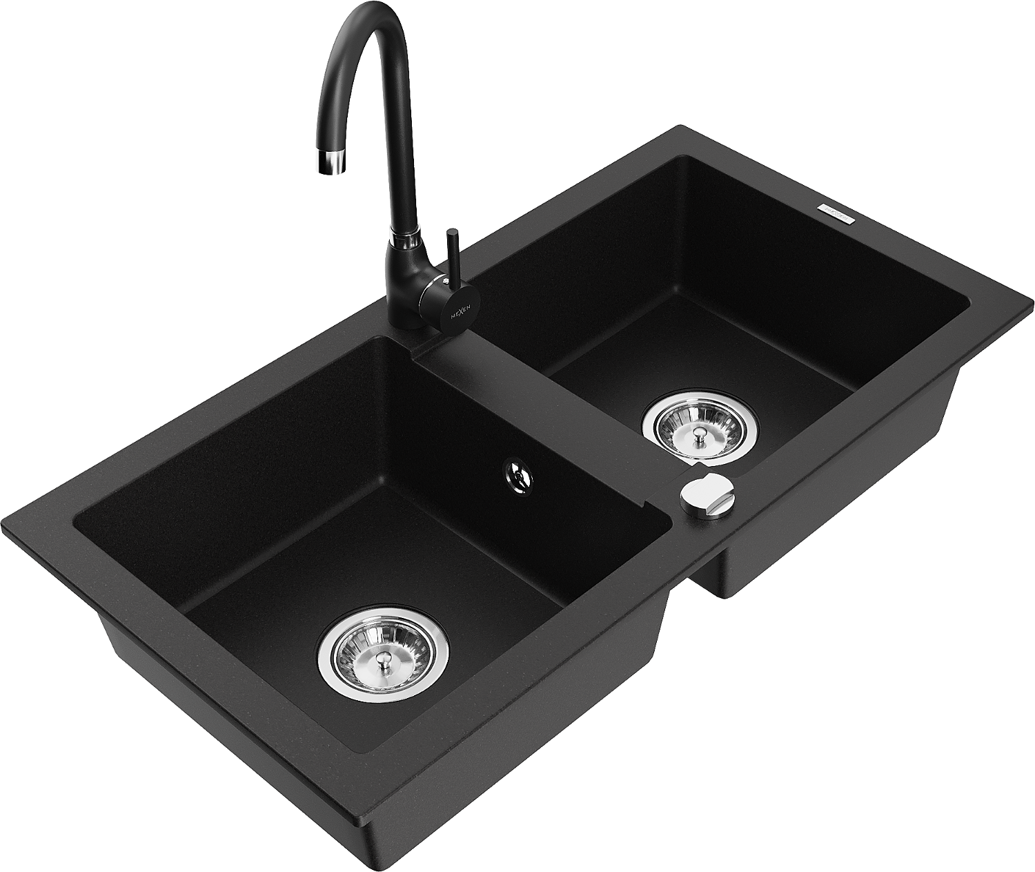 Mexen Mario гранитна кухненска мивка 2-коморова с кухненски смесител Telma, черен - 6504-77-670200-70