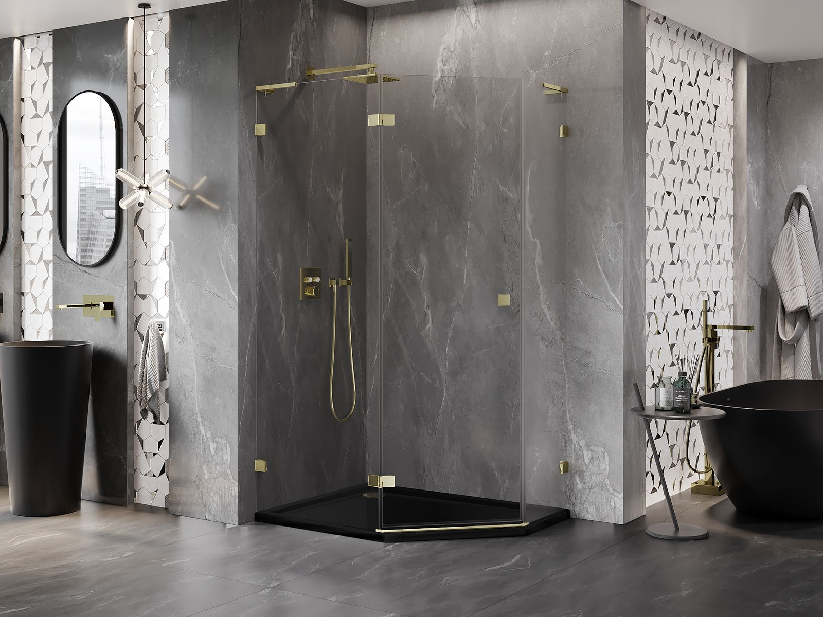 Mexen Lunar L петстенна душ кабина с отваряща се врата лява 100 x 90 cm, прозрачна, златна - 831L-100L-090P-50-00-L