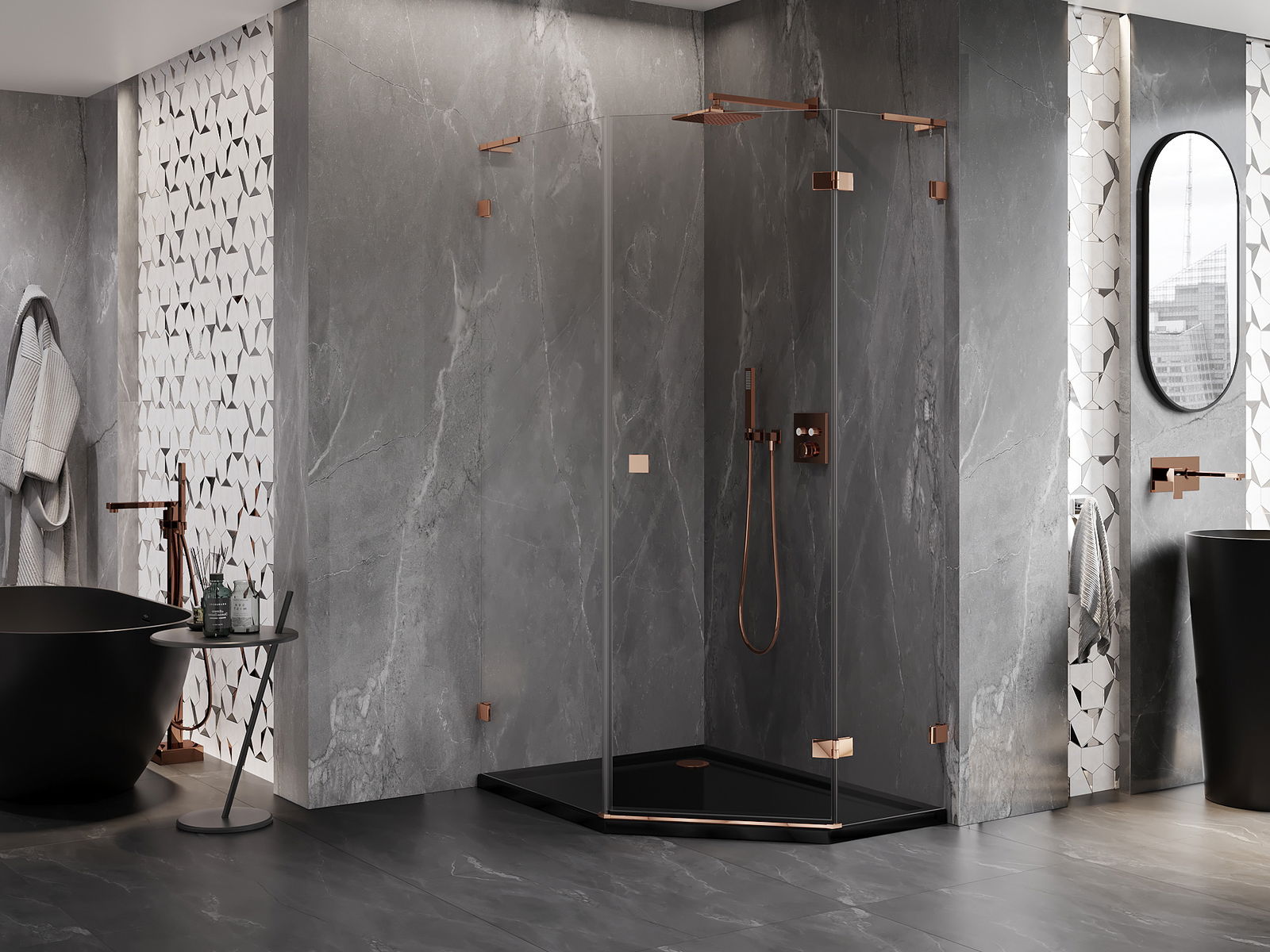 Mexen Lunar L петоъгълна душ кабина с отваряща се врата дясна 80 x 90 см, прозрачна, розово злато - 831L-080P-090L-60-00-P