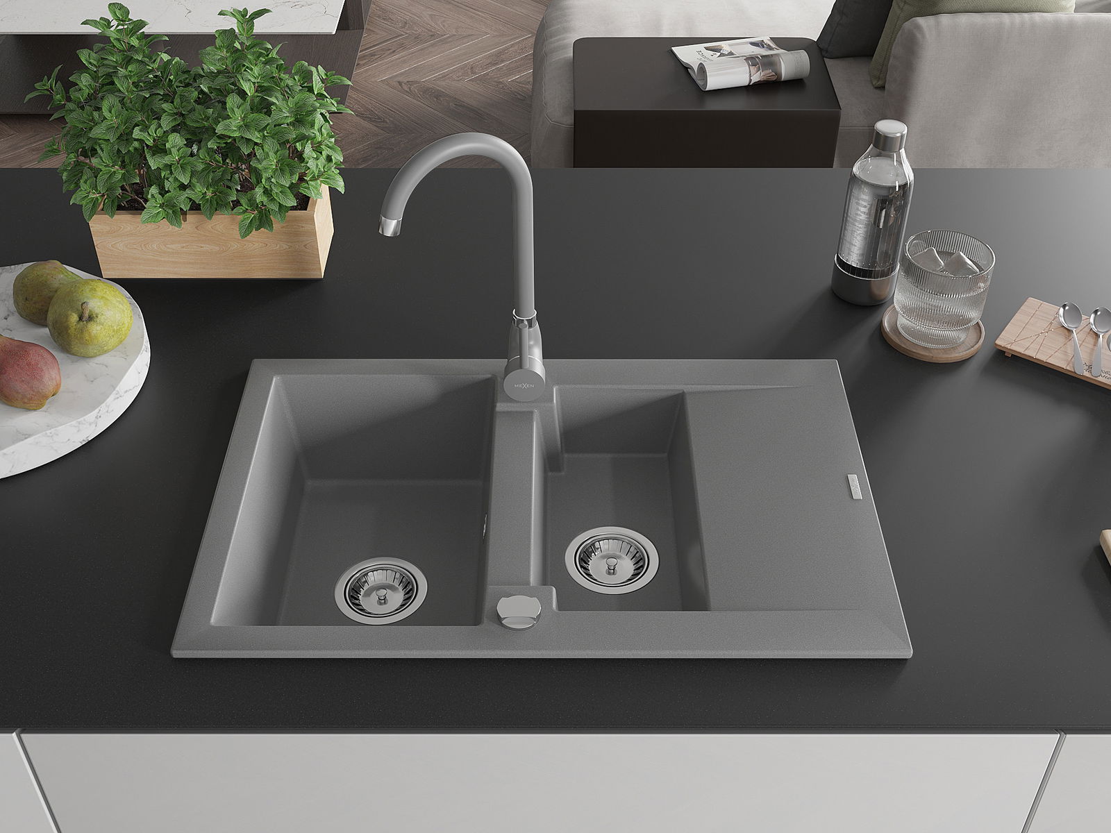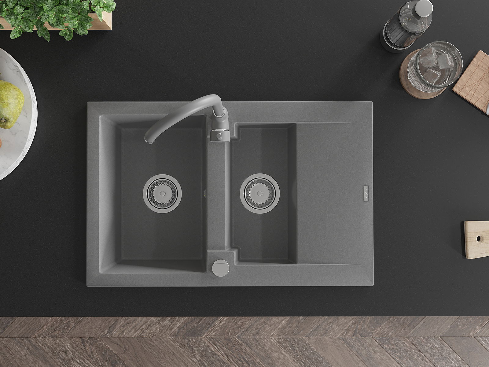 Mexen Gaspar гранитна мивка 1,5-камерна с оцеждаща решетка и кухненски смесител Telma, сива - 6507-71-670200-71
