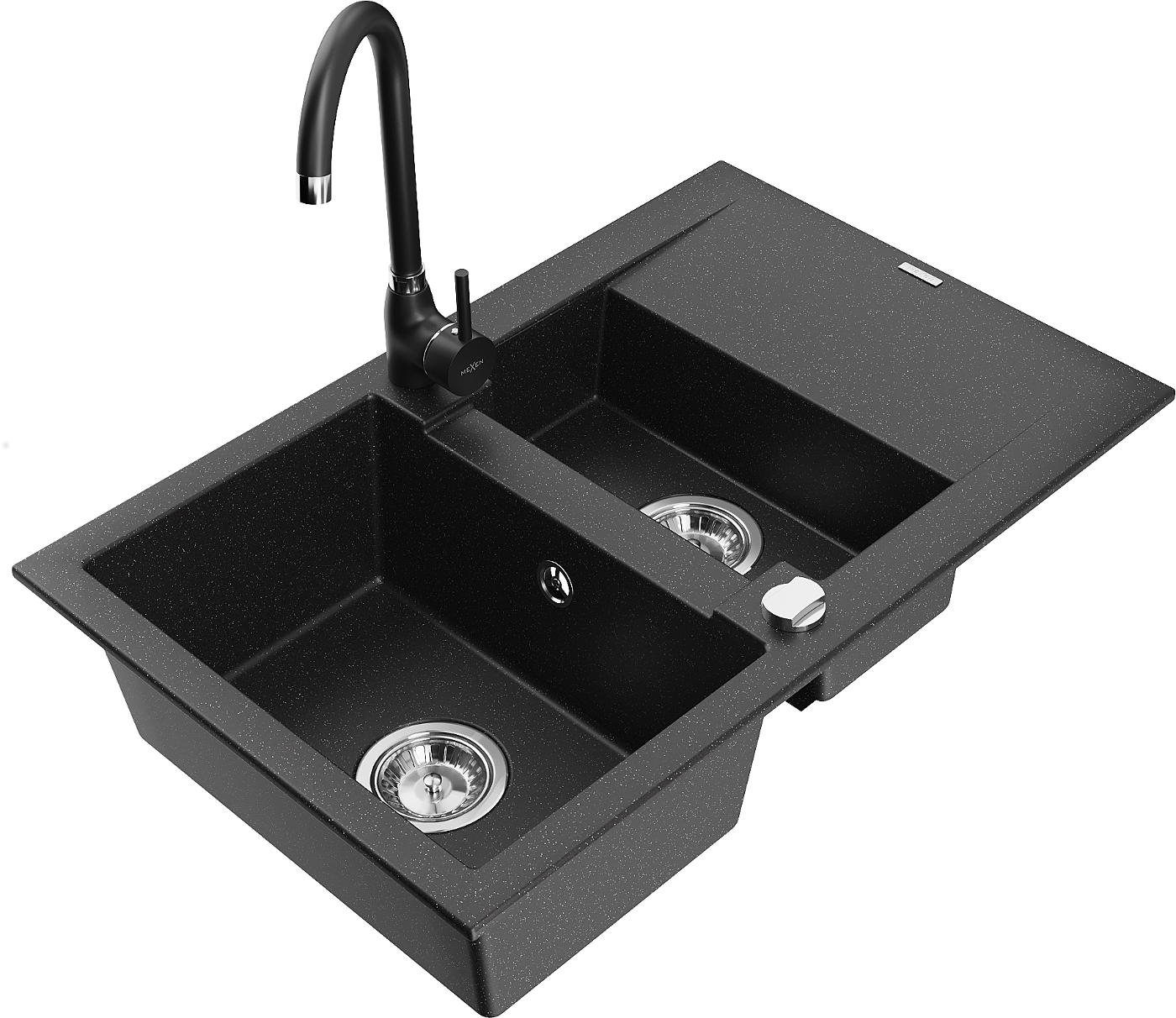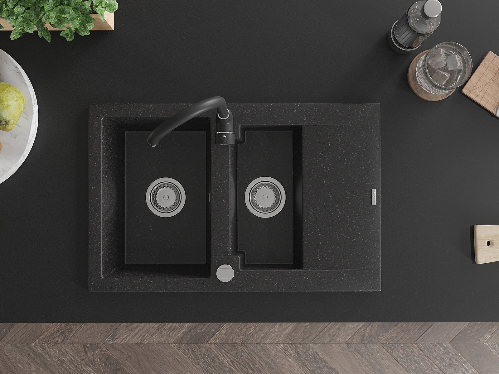 Mexen Gaspar гранитна мивка 1,5-камерна с отцедник и кухненски смесител Telma, черен / сребрист - 6507-73-670200-70