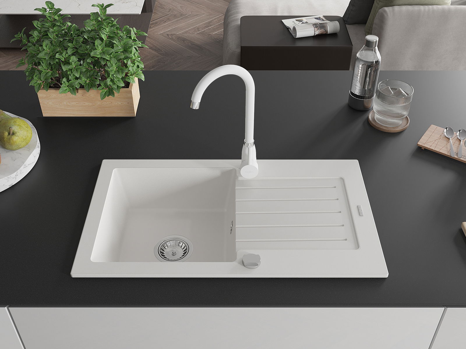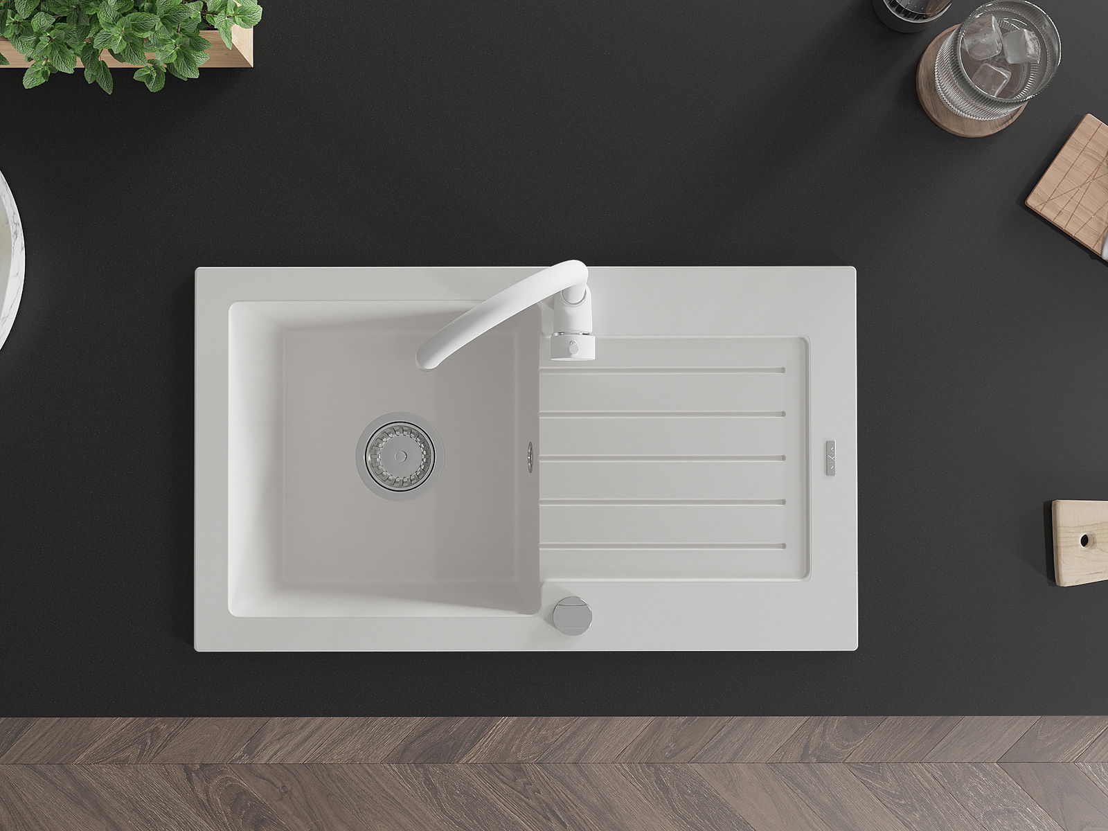 Mexen Pablo гранитна мивка с 1 отделение с отцедник и кухненски смесител Telma, бял - 6510-20-670200-20