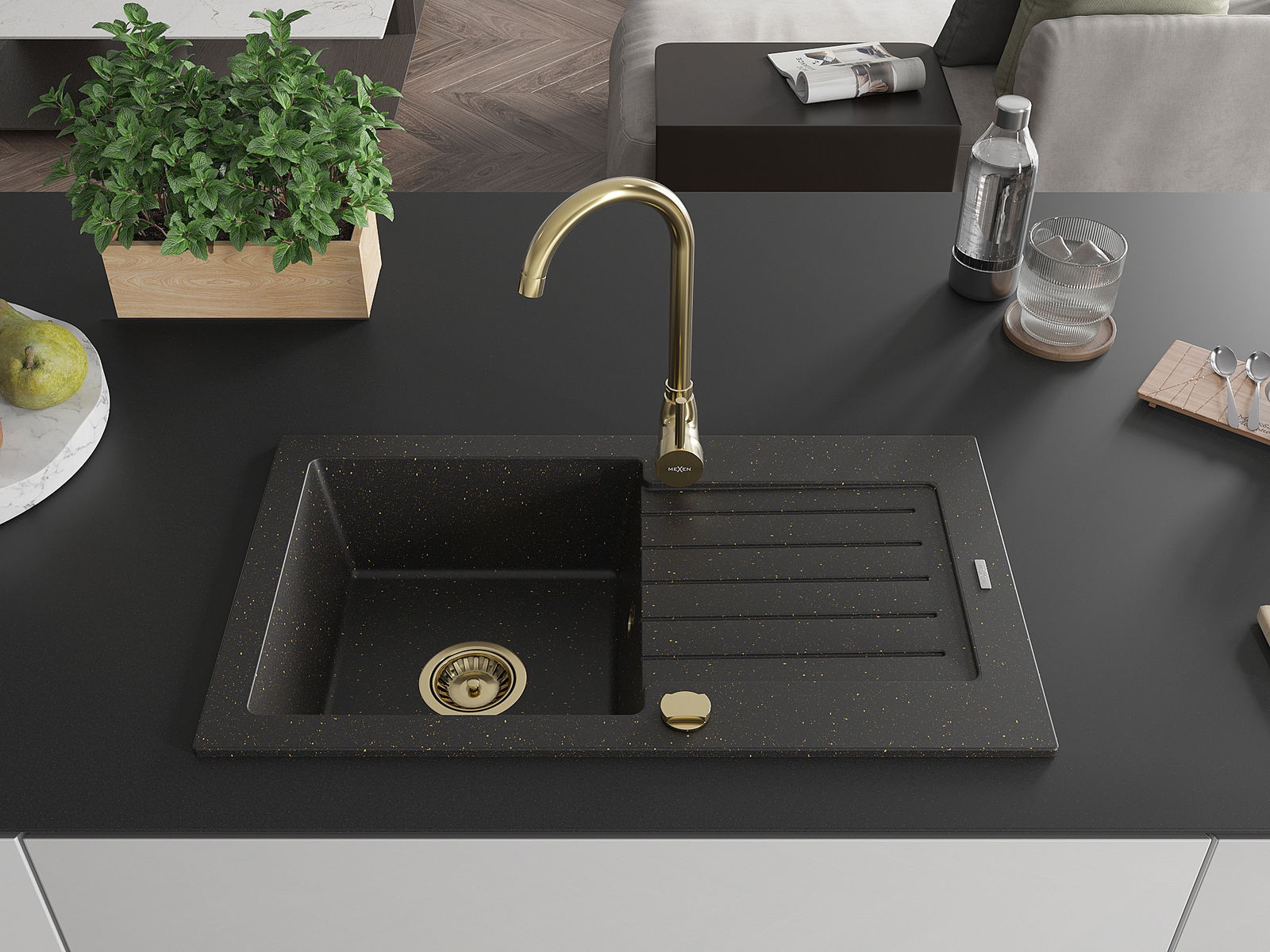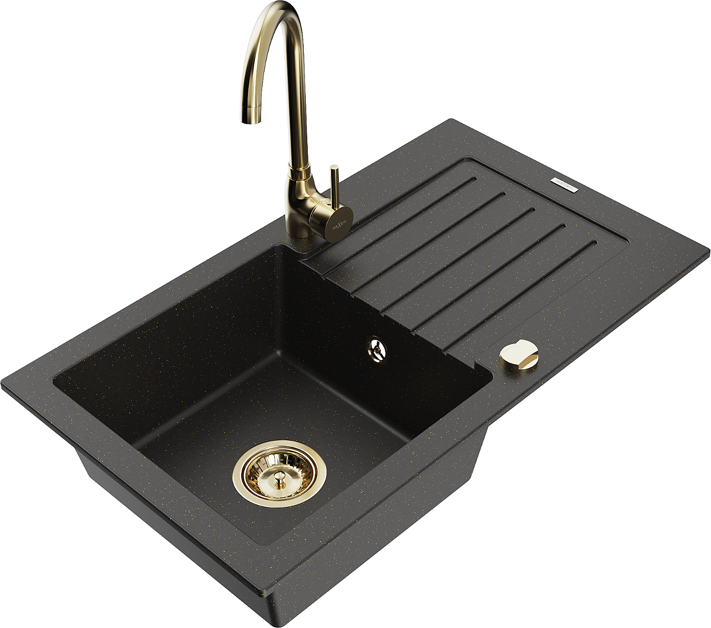 Mexen Pablo гранитна мивка с 1 отделение с отцедник и кухненски смесител Telma, черен/златен - 6510-75-670200-50