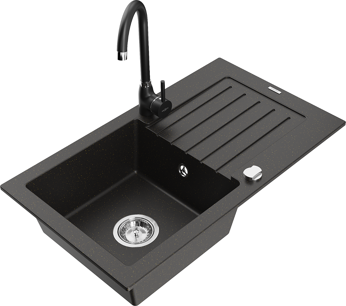 Mexen Pablo гранитна кухненска мивка с 1 корито и отцедник и кухненски смесител Telma, черно/златно - 6510-75-670200-70