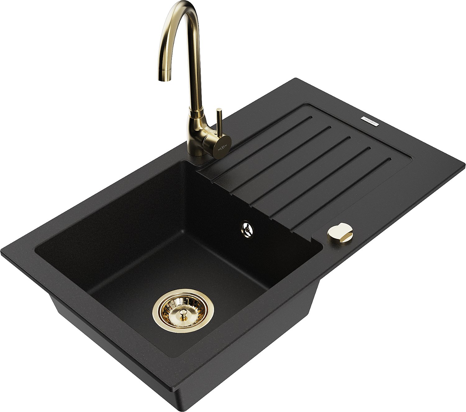 Mexen Pablo гранитна мивка с една камера с дренаж и кухненски смесител Telma, черен - 6510-77-670200-50