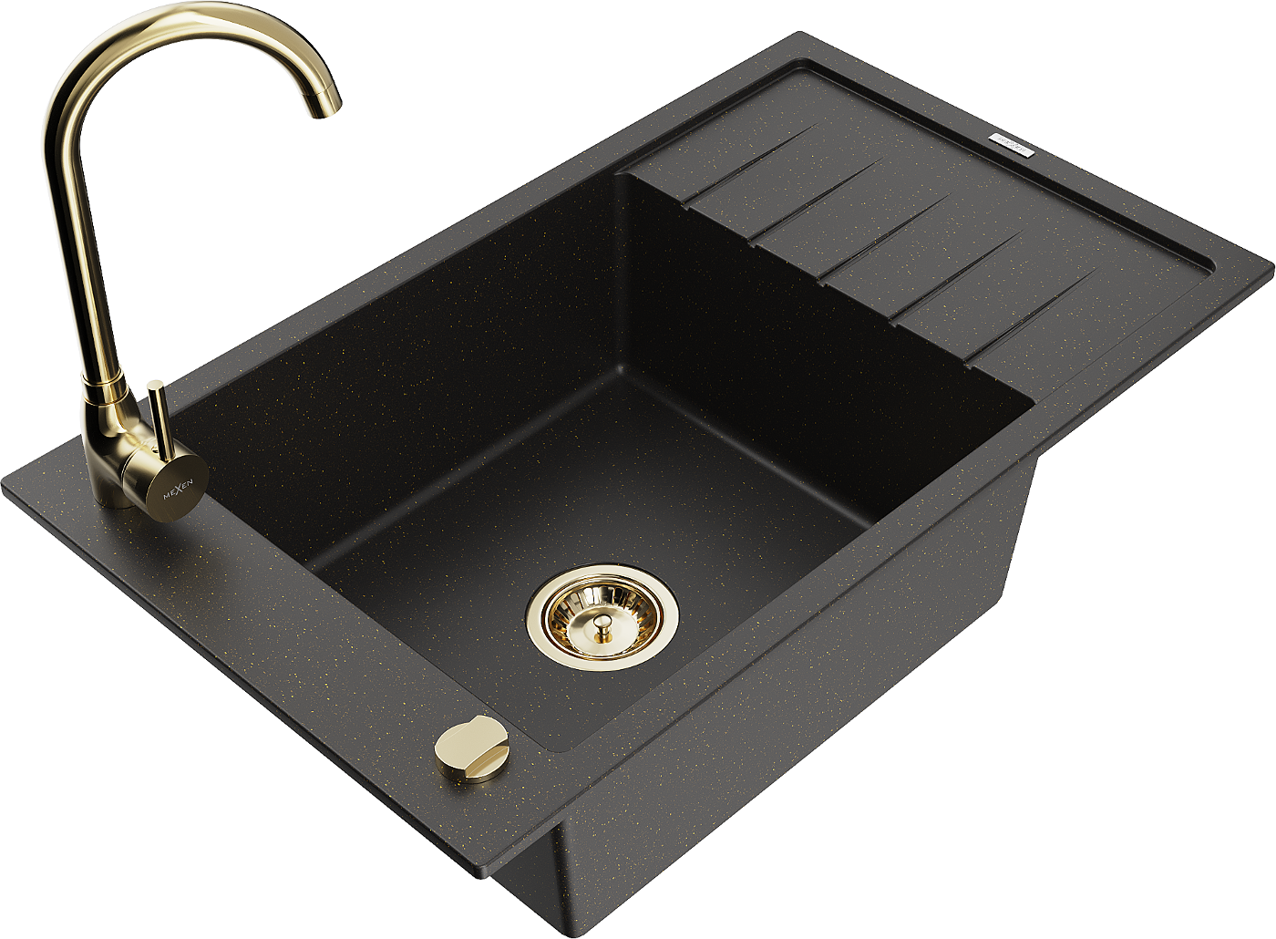 Гранитна кухненска мивка Mexen Elias с 1 отделение с отцедник и кухненски смесител Telma, черно/златно - 6511-75-670200-50