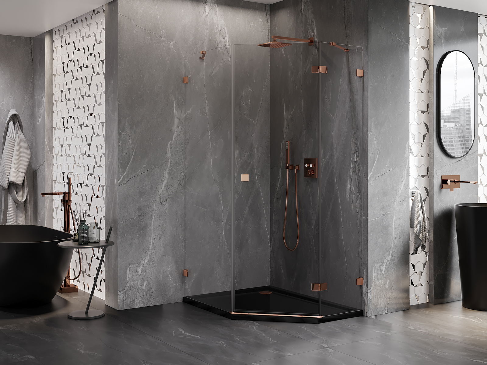 Mexen Lunar петоъгълна душ кабина, отваряща се надясно, 90 x 100 см, прозрачна, розово злато - 831-090P-100L-60-00-P