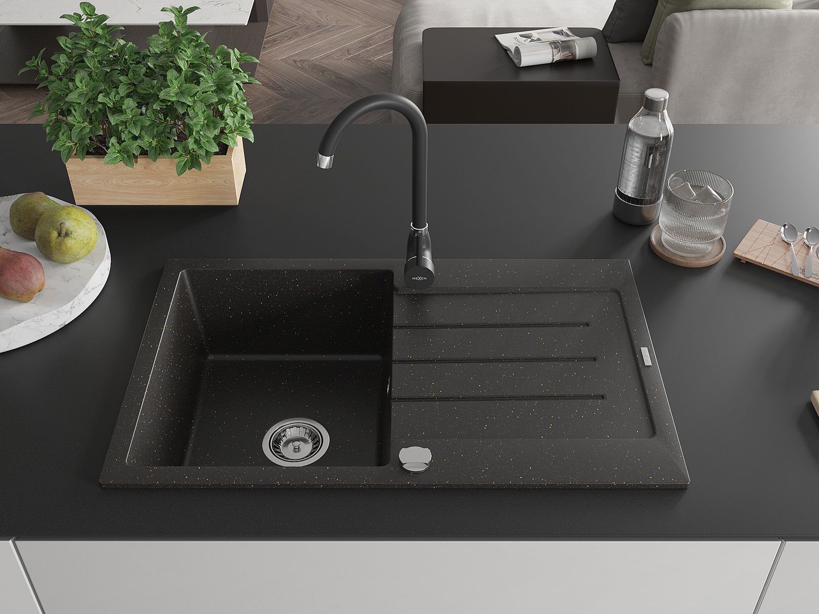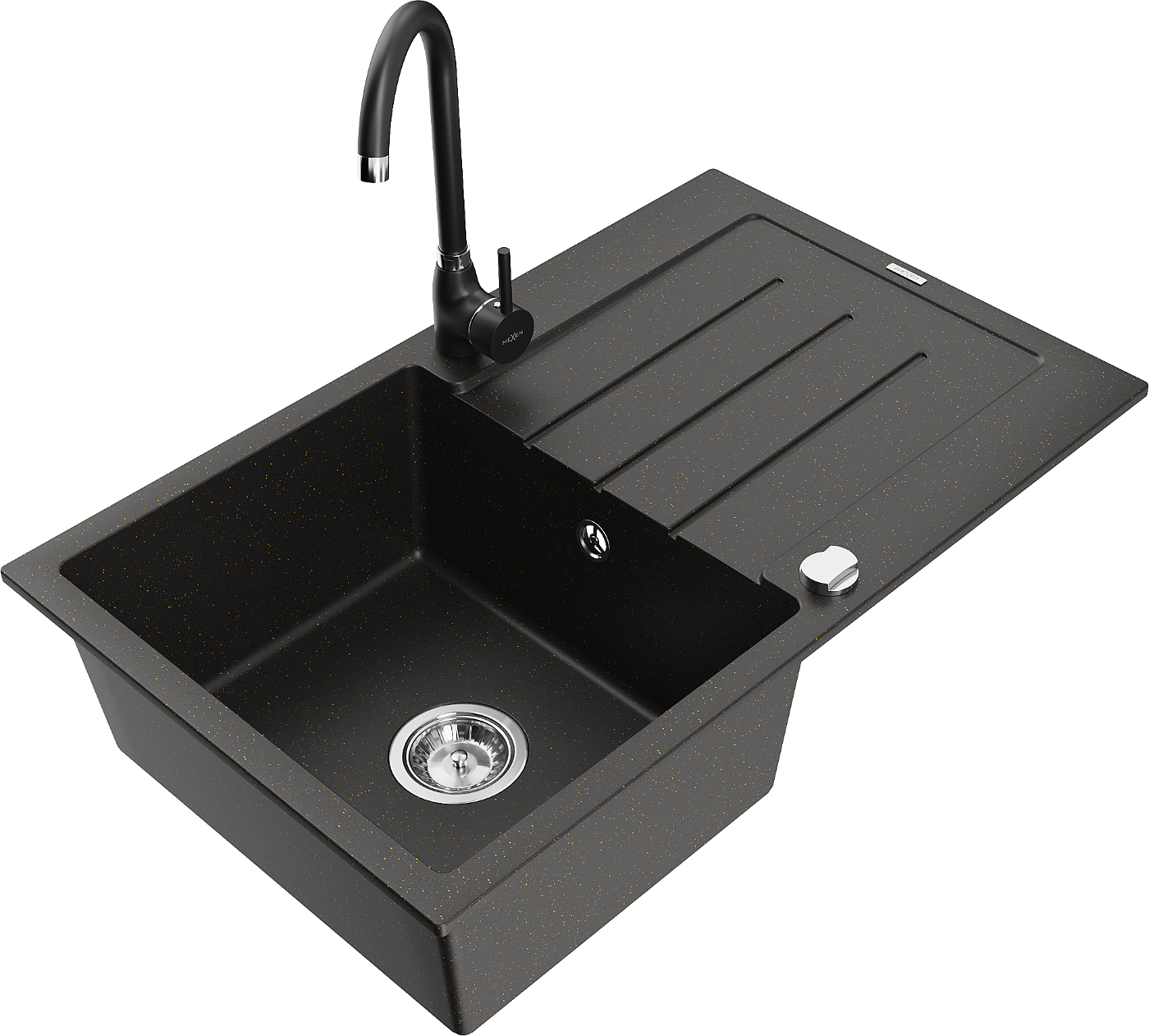Mexen Bruno гранитна мивка с една камера и капковник и кухненски смесител Telma, черен/златен - 6513-75-670200-70