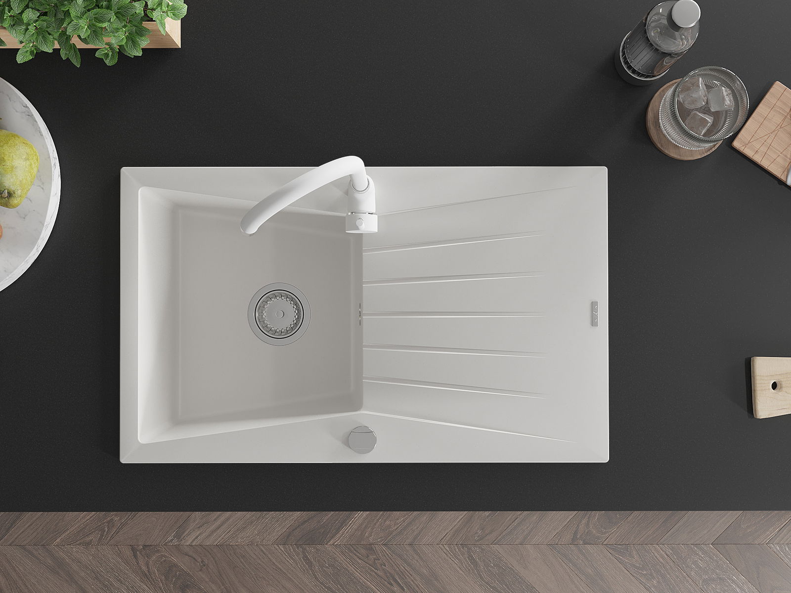 Mexen Cesar гранитна мивка с 1 камера, сушилник и кухненски смесител Telma, бял - 6514-20-670200-20