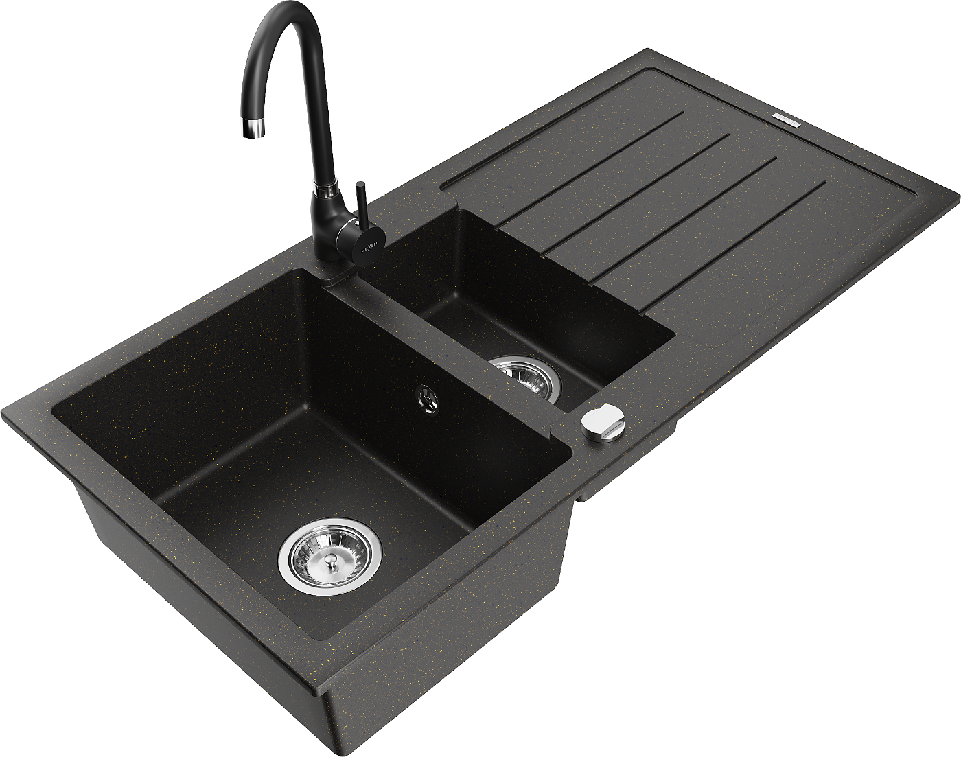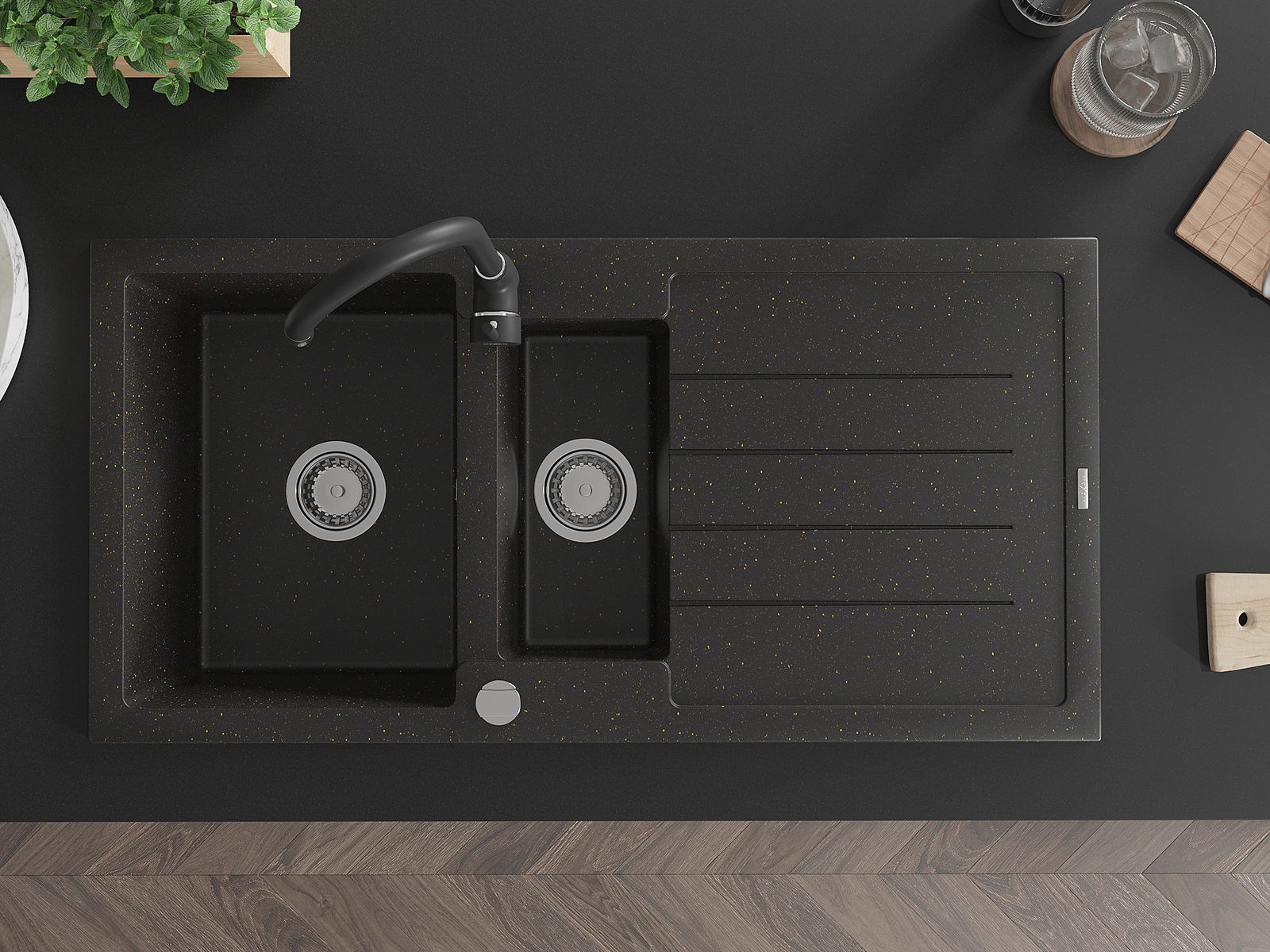 Mexen Andres гранитна мивка 1,5-камерна с отцедник и кухненски смесител Telma, черен/златен - 6515-75-670200-70