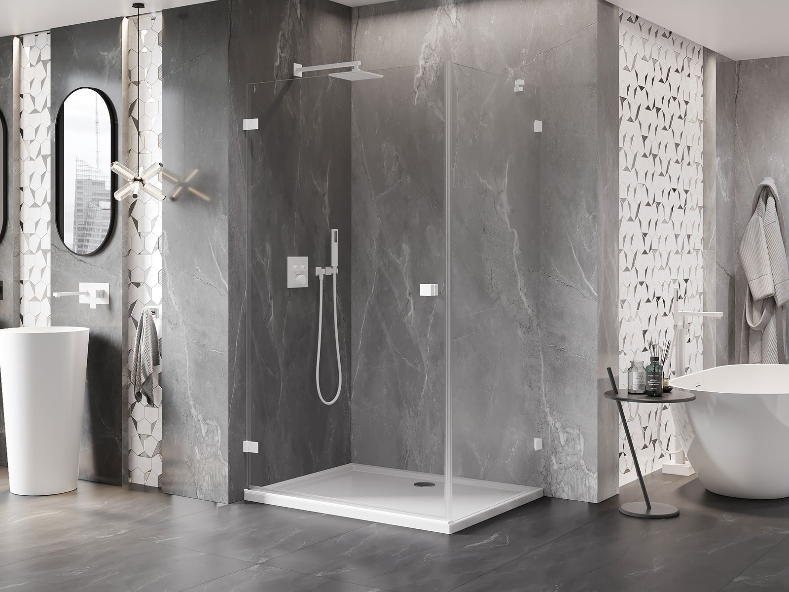 Удобната и практична дръжка е изработена от здрав и устойчив метал. Модерната форма в съчетание с покритието, съответстващо на цвета на профилите, придава на цялото модерен и стилен вид, подчертавайки естетиката на всяка баня.