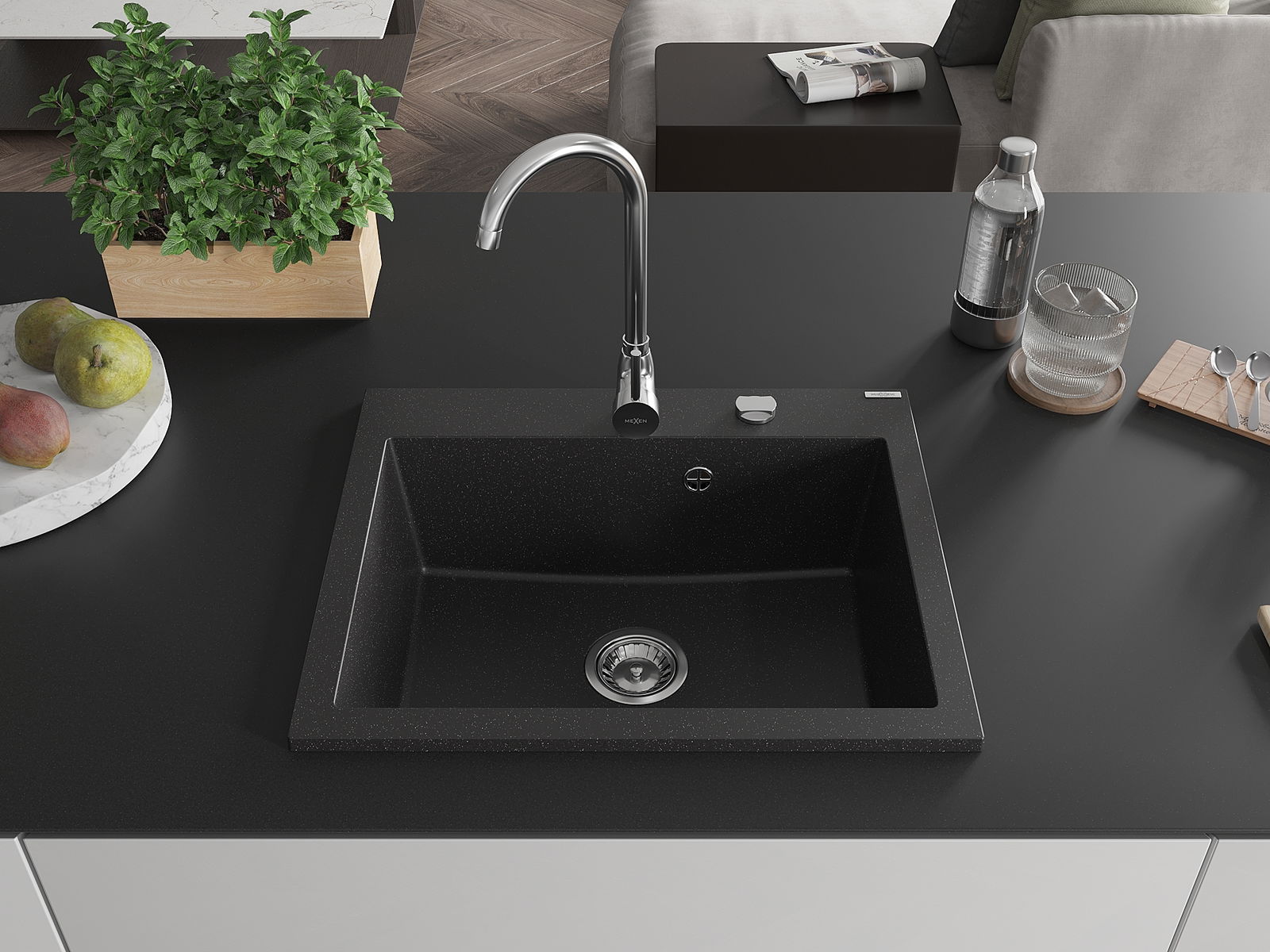 Mexen Elix кухненска мивка от гранит с 1 отделение 600 x 500 мм, черно/сребро металик, сифон хром - 6525601005-73