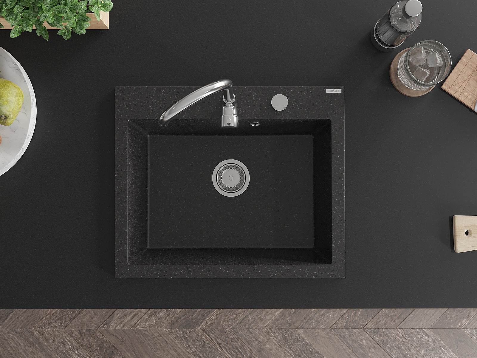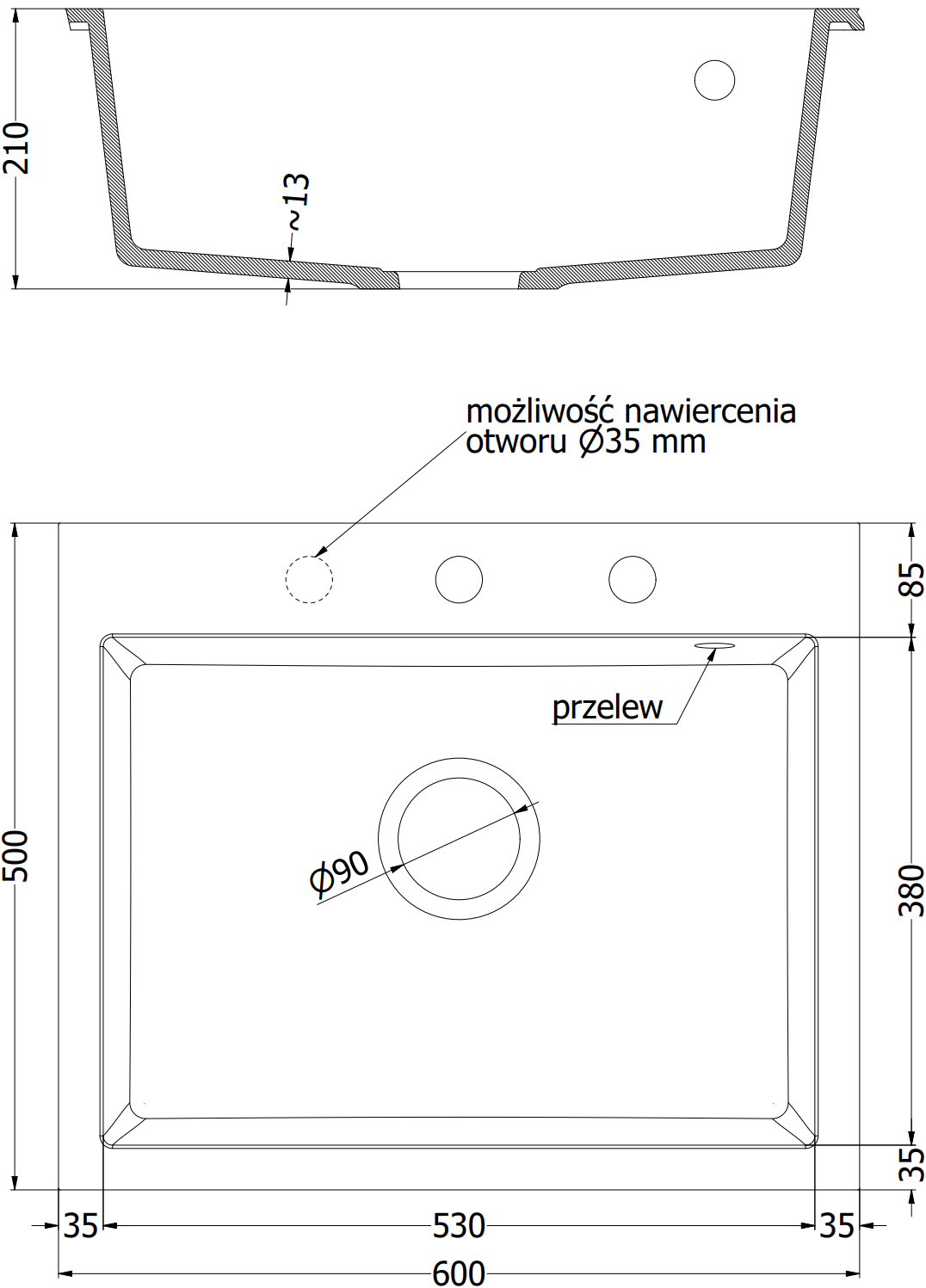 Мивката разполага с предварително издълбан отвор с диаметър 35 мм за самостоятелно изключване. Може да се използва, наред с други неща, за монтаж на дозатор за течност, който ще елиминира наличието на пластмасови бутилки в кухнята и ще й придаде елегантно завършване.