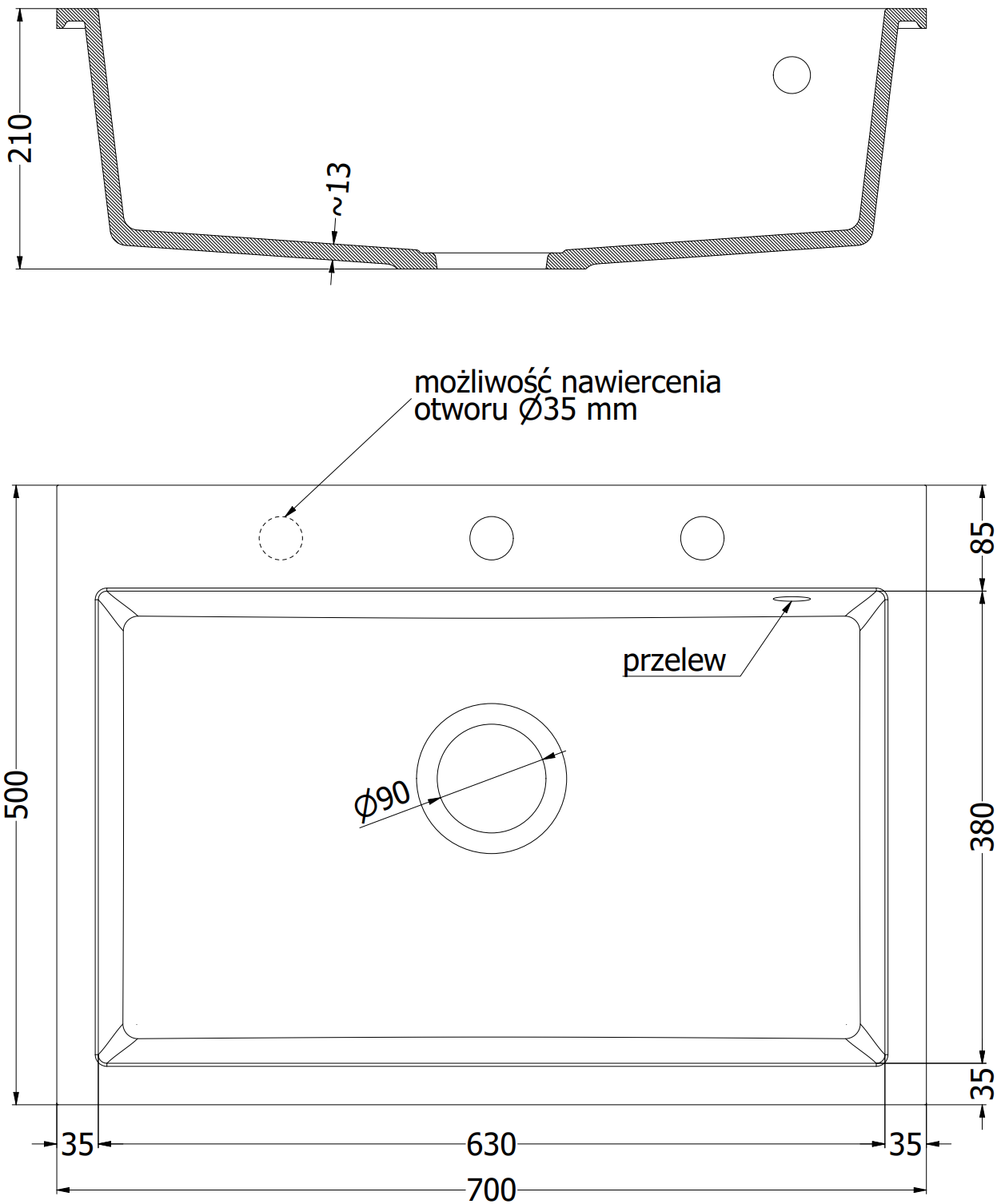 Мивката разполага с предварително издълбан отвор с диаметър 35 мм за самостоятелно изключване. Може да се използва, наред с други неща, за монтаж на дозатор за течност, който ще елиминира наличието на пластмасови бутилки в кухнята и ще й придаде елегантно завършване.