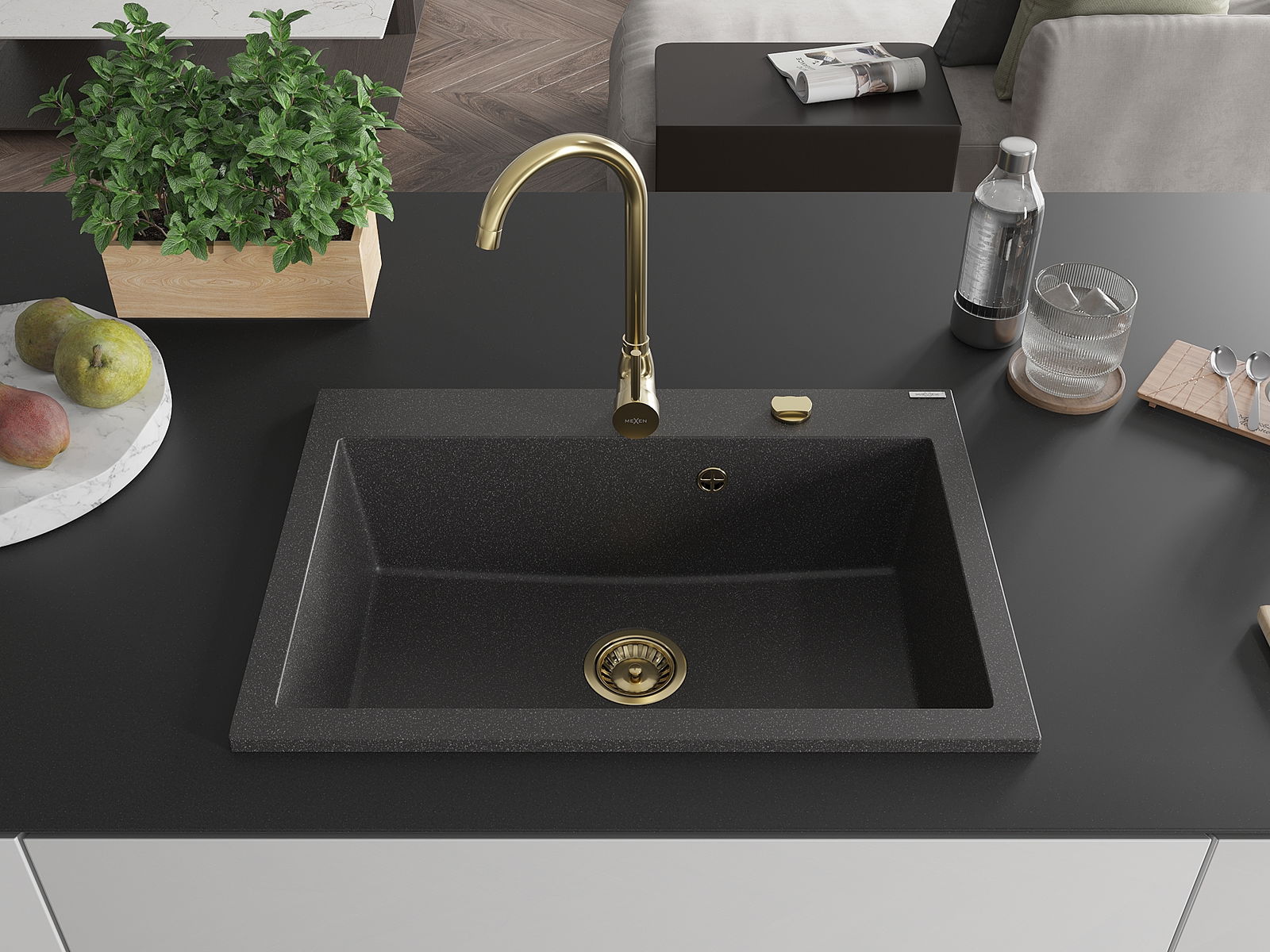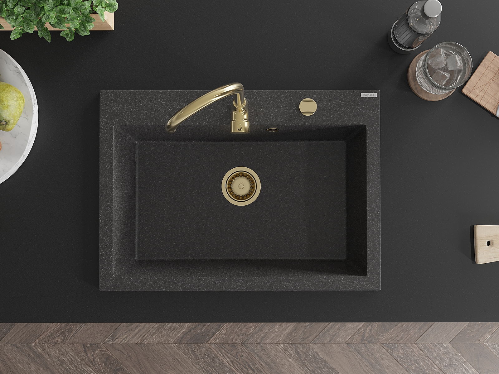 Mexen Elix гранитна мивка със сифон 1-камерна 700 x 500 мм, черно с пръски, златен сифон - 6526701005-76-G