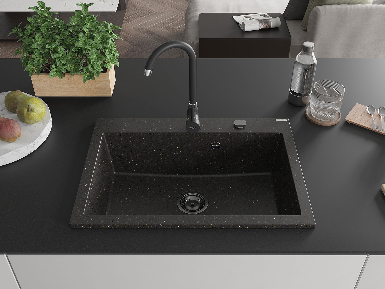 Mexen Elix гранитна мивка с 1 камера 700 x 500 mm, черна/златист металик, черен сифон - 6526701005-75-B