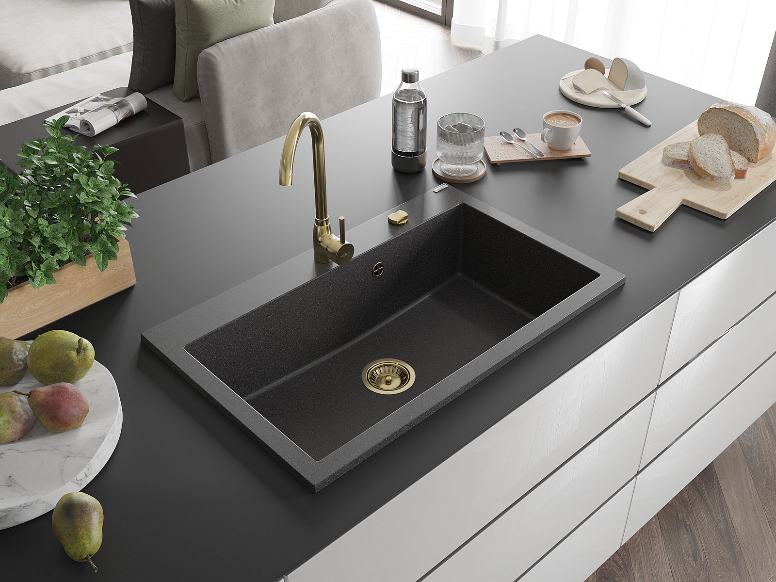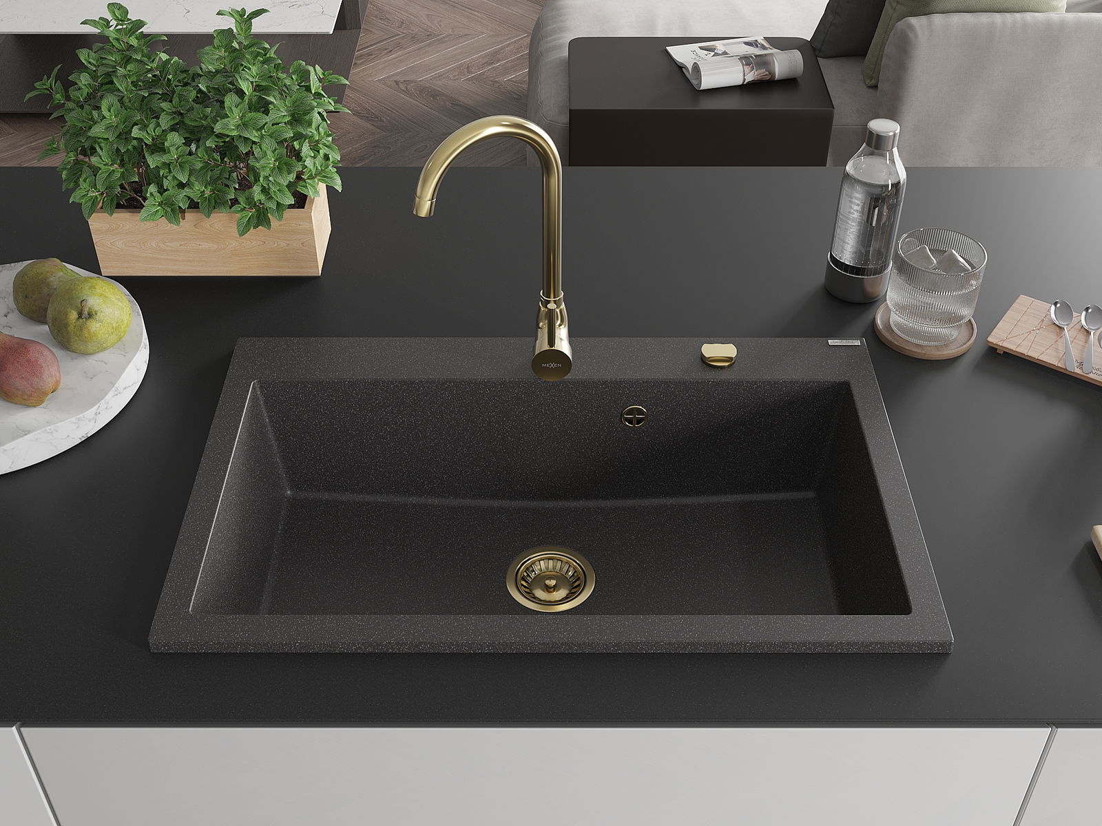 Mexen Elix гранитна мивка с 1 камера 800 x 500 мм, черна на петна, златен сифон - 6527801005-76-G