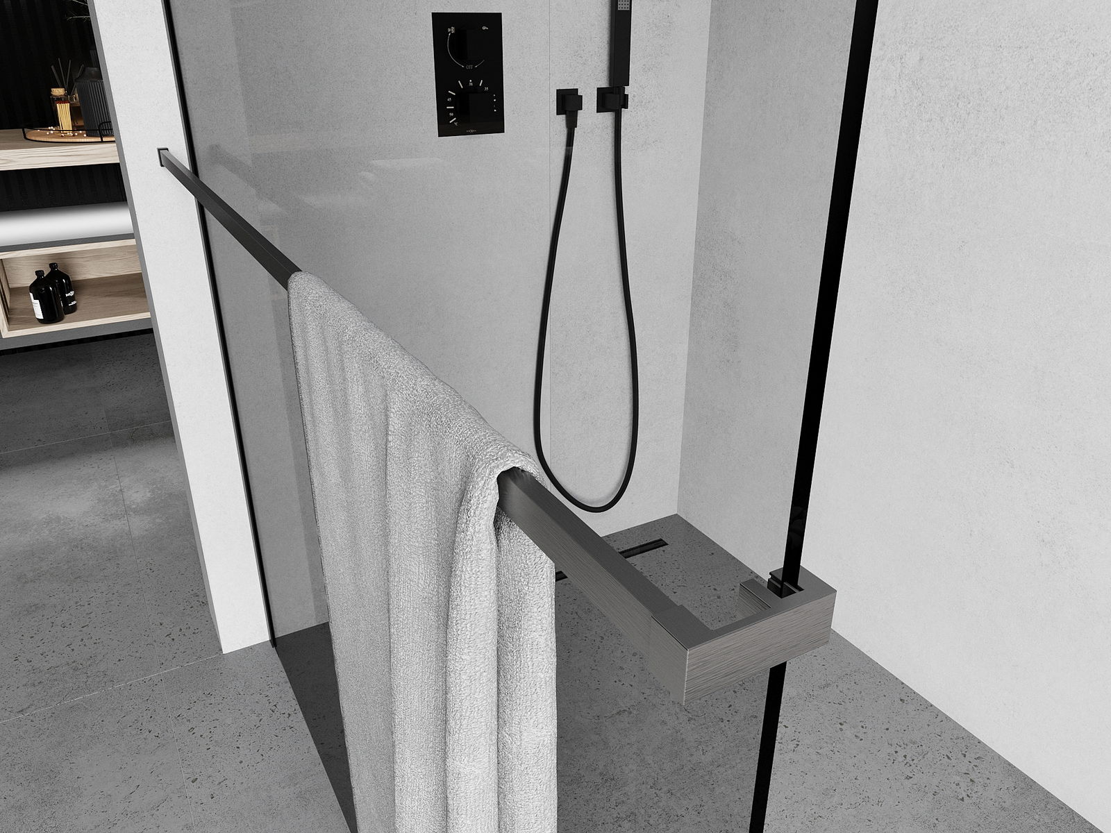 Релингът за кърпи, монтиран на стената на душа, е практично и функционално решение, което позволява удобно закачане на кърпи в непосредствена близост до зоната за къпане, което увеличава комфорта на ежедневното използване.