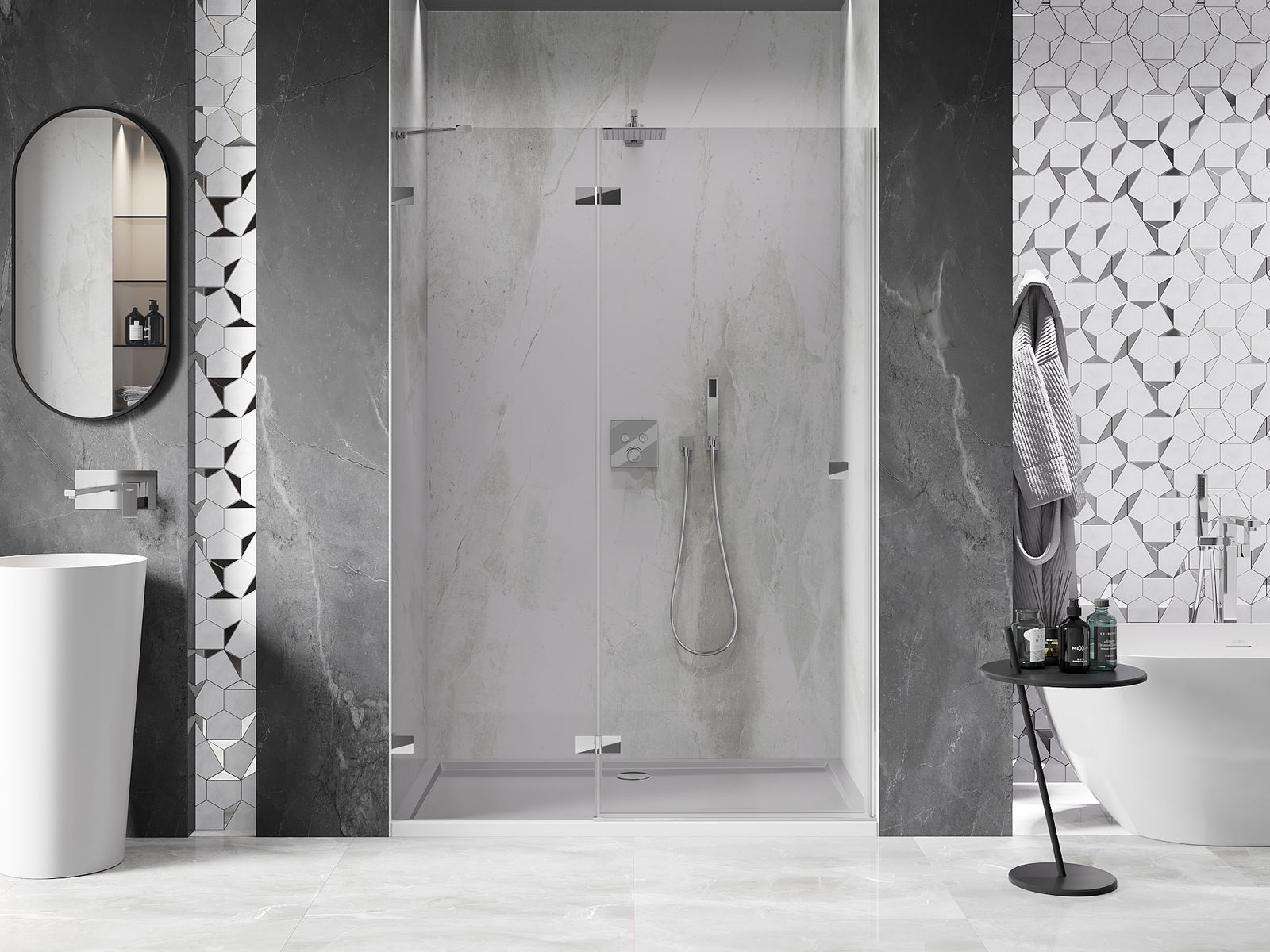 Удобната и практична дръжка е изработена от здрав и устойчив метал. Модерната форма в съчетание с покритието, съответстващо на цвета на профилите, придава на цялото модерен и стилен вид, подчертавайки естетиката на всяка баня.