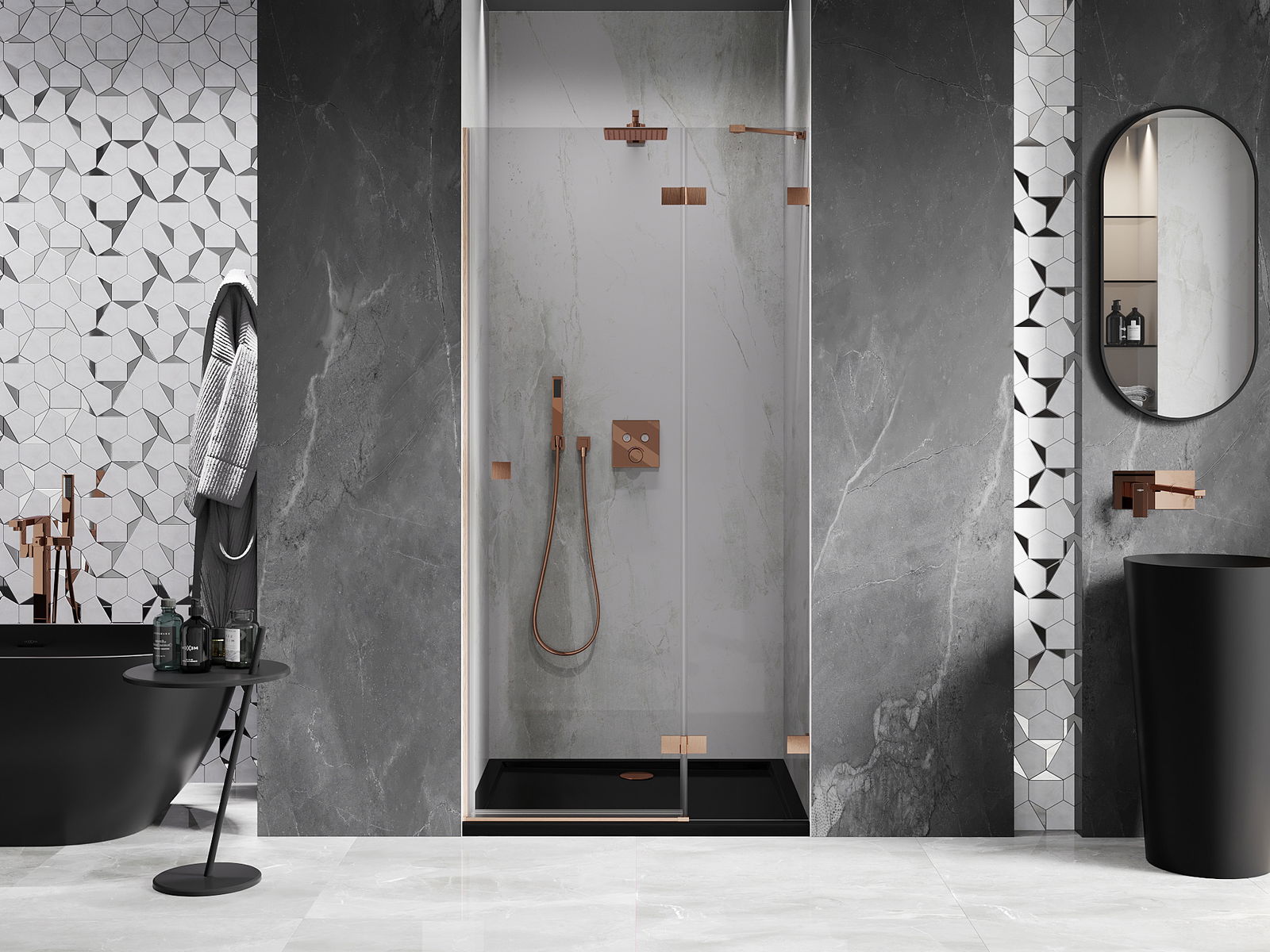 Скобите и пантите са изработени от много издръжлив месинг и създават плосък стъклен панел. Това е отличен избор, който съчетава елегантност, издръжливост и модерен дизайн. Благодарение на такива решения, душът придобива естетика и същевременно улеснява поддържането на чистота.