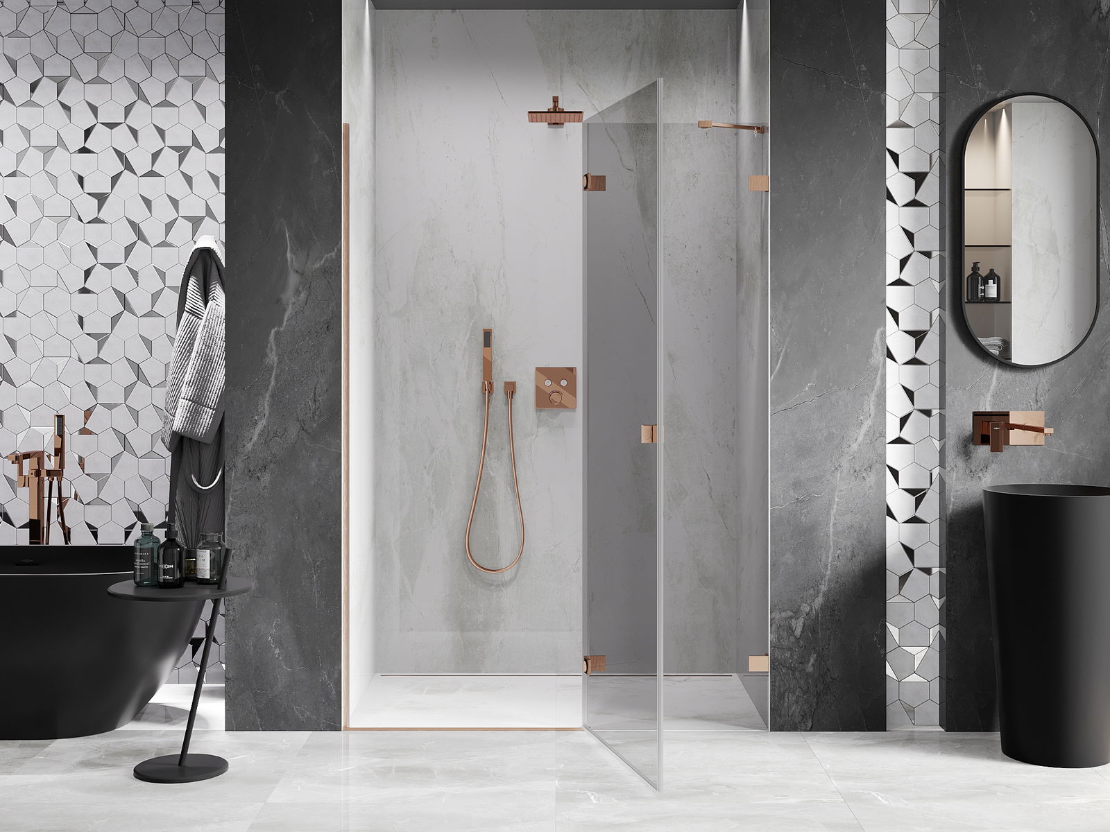 Скобите и пантите са изработени от много издръжлив месинг и създават плосък стъклен панел. Това е отличен избор, който съчетава елегантност, издръжливост и модерен дизайн. Благодарение на такива решения, душът придобива естетика и същевременно улеснява поддържането на чистота.