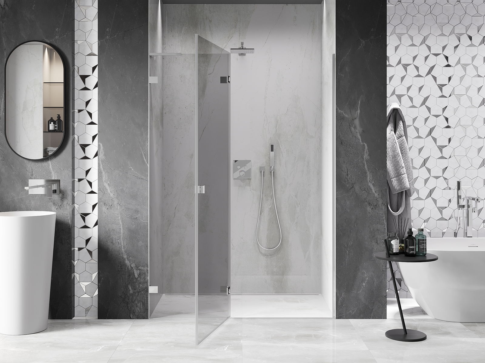 Удобната и практична дръжка е изработена от здрав и устойчив метал. Модерната форма в съчетание с покритието, съответстващо на цвета на профилите, придава на цялото модерен и стилен вид, подчертавайки естетиката на всяка баня.