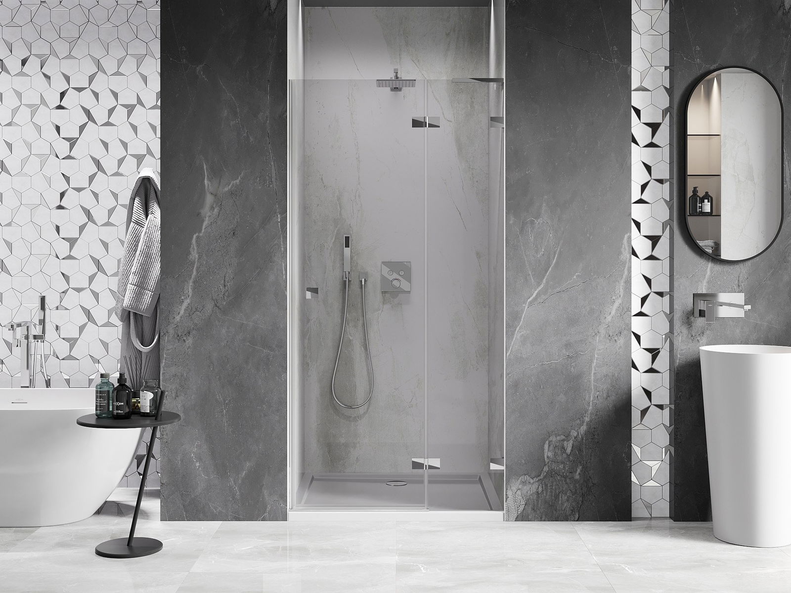 Скобите и пантите са изработени от много издръжлив месинг и създават плосък стъклен панел. Това е отличен избор, който съчетава елегантност, издръжливост и модерен дизайн. Благодарение на такива решения, душът придобива естетика и същевременно улеснява поддържането на чистота.