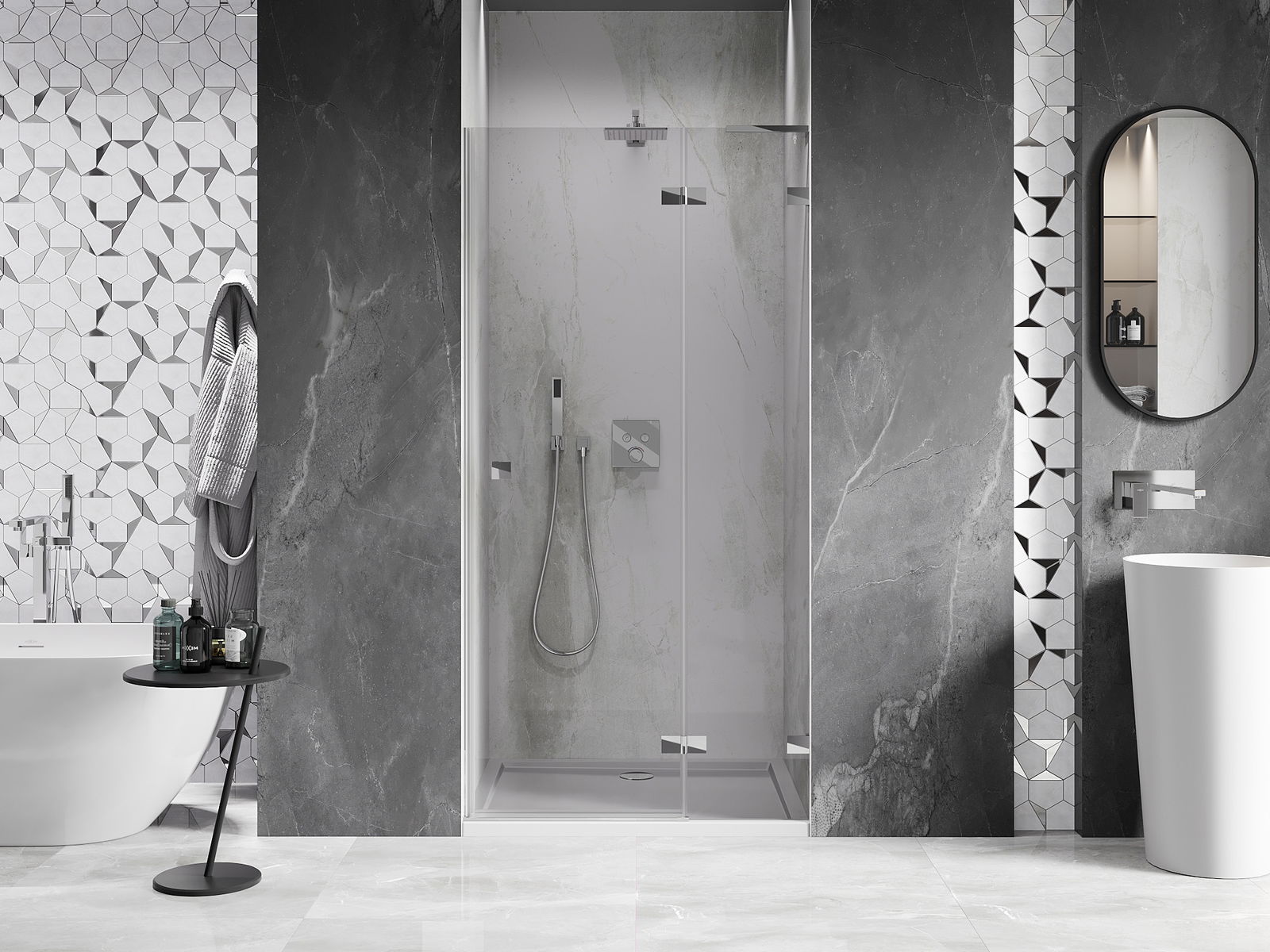 Удобната и практична дръжка е изработена от здрав и устойчив метал. Модерната форма в съчетание с покритието, съответстващо на цвета на профилите, придава на цялото модерен и стилен вид, подчертавайки естетиката на всяка баня.